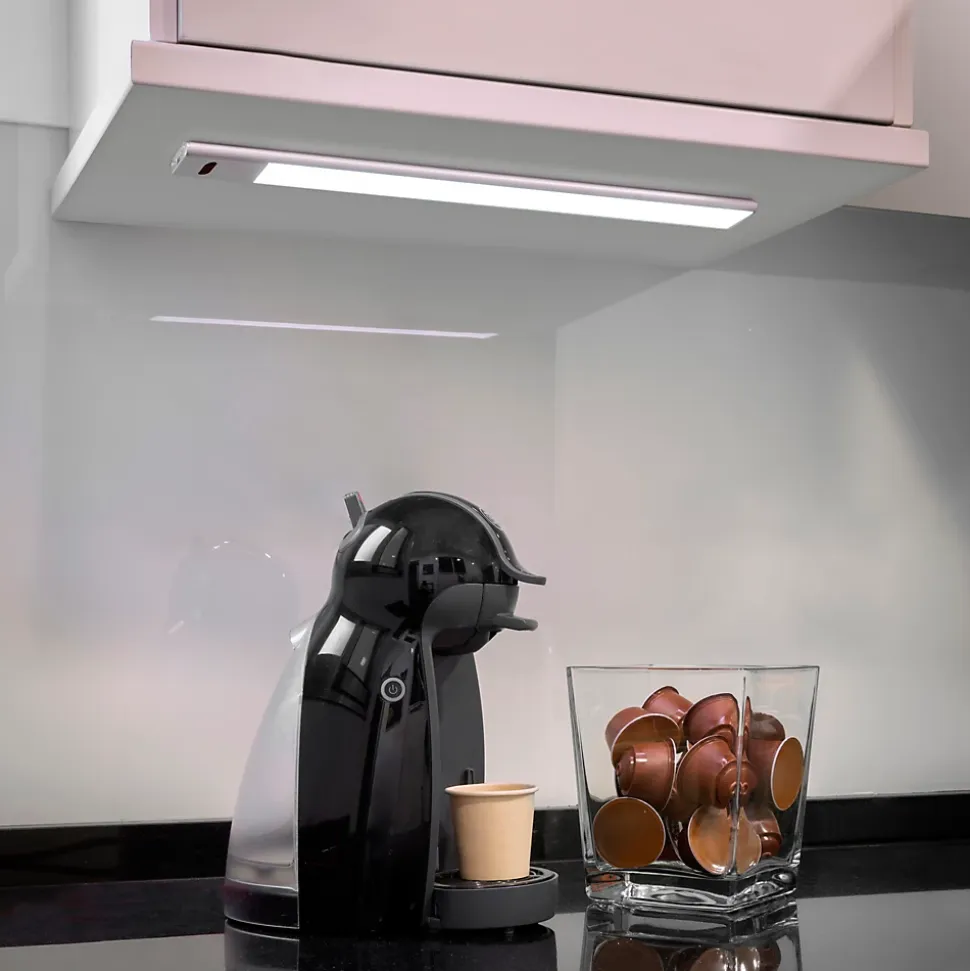 Luminaire LED qui permet d’éclairer la cuisine et les armoires sans avoir besoin de câbles, avec un élégant design extra-plat et une longueur de 400 mm.Il dispose d’un capteur de proximité intégré qui allume le luminaire lorsque vous passez votre main dans sa zone de détection de 7 cm et s’éteint automatiquement lorsque vous passez à nouveau votre main.Il dispose d’une batterie rechargeable 850mAh au lithium polymère avec une durée de mise sous tension de 20 secondes pour 400 cycles, plus un interrupteur manuel marche/arrêt.La batterie peut être rechargée avec un chargeur de téléphone cellulaire conventionnel 5V DC 1A (non inclus) et un câble micro USB de type C de 30 cm (inclus), en moins de 2 heures (indicateur d’état de charge LED).Il est très facile à fixer, il suffit de coller quelques bases métalliques adhésives sur le meuble et le luminaire adhère magnétiquement, de sorte qu’il peut être facilement retiré pour être rechargé.Les vis et le ruban adhésif de montage sont fournis.Technologie LED à bas consommation.Flux lumineux 180 lumens.Puissance 3 W.Température de couleur blanche variable 3.000 – 4.000 – 6.000 Kelvin. Le réglage peut être effectué en appuyant sur le bouton latéral ou en passant la main sur le capteur deux fois de suite.Faisceau de lumière de 150º.Luminaire parfait pour zones sèches, IP 20.Il est fabriqué en aluminium et en plastique avec une finition anodisée mate. VOIR LES MESURES DU PRODUIT DANS LES IMAGES. Le luminaire LED Kaus est conçu comme un éclairage de cuisine et d’armoire sans fil, avec un élégant design en aluminium extra-plat. Avec ce luminaire LED, vous pouvez éclairer l’intérieur de vos armoires, le comptoir de la cuisine ou les zones de passage de votre maison, avec une couleur blanche