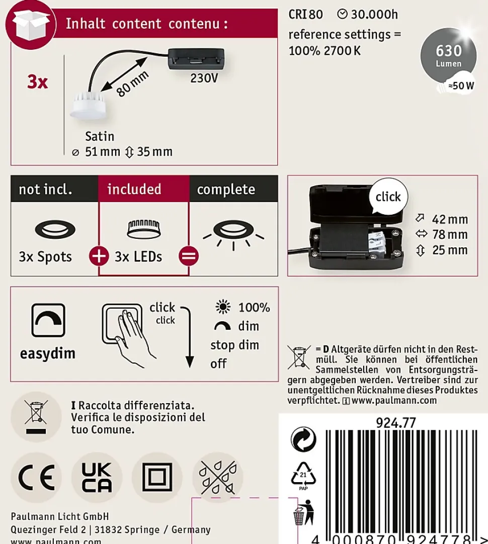 Kit de 3 modules LED et boîte de jonction à double borne|À combiner avec le kit de spots Choose!|Température de couleur: 2700K – Blanc chaud|EasyDim : variation de l’intensité en continu grâce à votre interrupteur mural existant