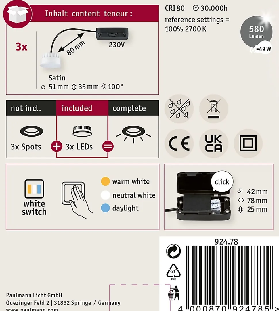 Les ampoules Coin plates et équipées de la fonction WhiteSwitch sont compatibles avec toutes les bagues de montage de la série Choose. La fonction intégrée WhiteSwitch permet de naviguer entre trois températures de couleur en actionnant plusieurs fois un commutateur traditionnel. Avec la série Choose, combinez les spots encastrés de votre choix facilement et selon vos envies. Les spots encastrés sont combinables sans restriction et ne requièrent pas de transfo, toutes les ampoules sont remplaçables.