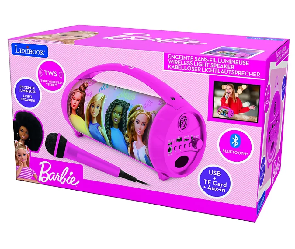 Enceinte Bluetooth Sans-Fil Lumineuse avec Micro Barbie – Bluetooth 5.0 sans-fil, effets lumineux multicolores, micro karaoké intégré, ports USB/SD/Aux-IN, fonction TWS, batterie rechargeable 1200 mAh pour plusieurs heures d’utilisation continue.