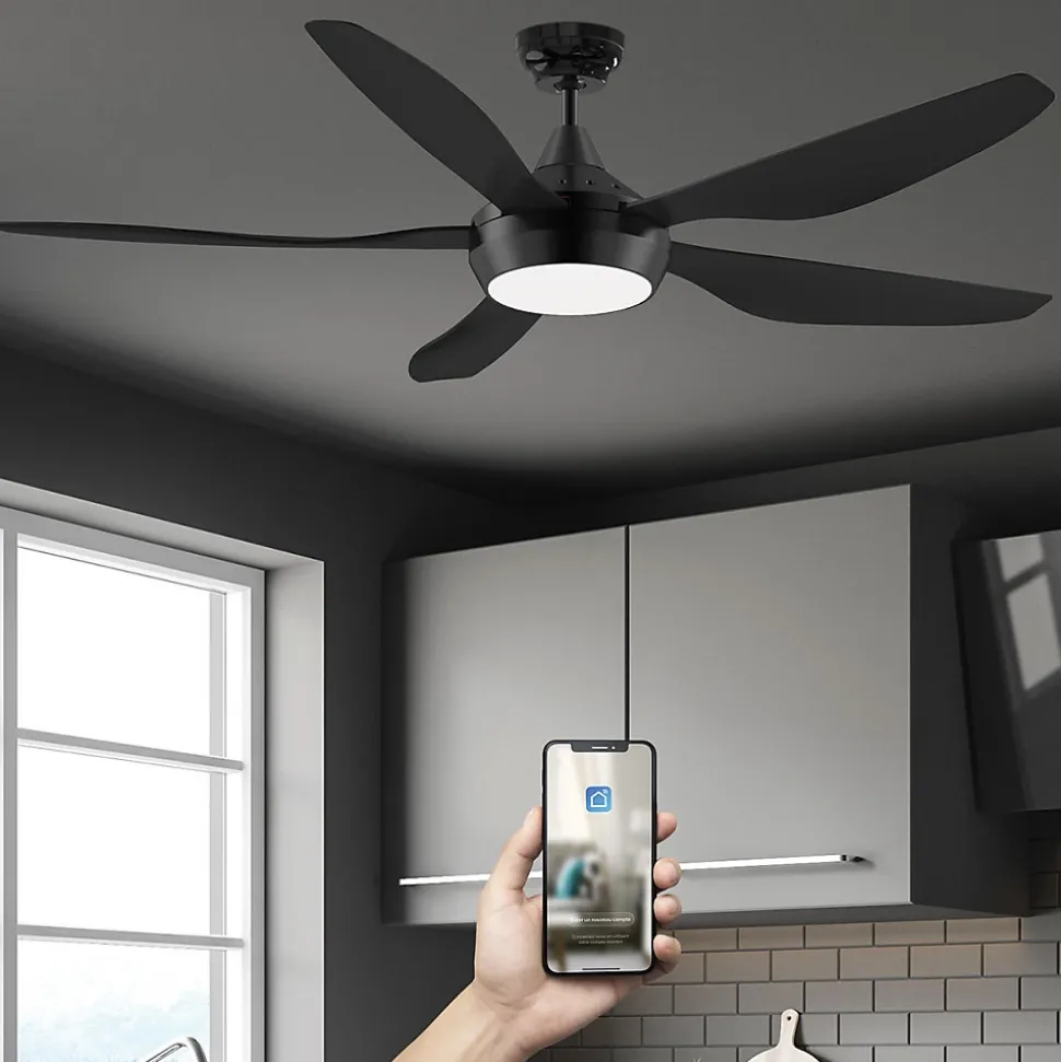 BRASSEUR D’AIR 137 CM MAUPITIMoteur à courant continu, très économique en énergie, très silencieuxTrès fort débit d’air6 vitesses de fonctionnementTélécommande avec support muralTélécommande programmable sur plusieurs ventilateursLumière LED 20W 3 couleurs dimmables (6000°K / 4000°K / 3000°K)Compatible Wifi (APP Smart Life)Compatible contrôles vocaux (Amazon Alexa et Google Home)Fonction mémoire Marche/Arrêt (gestion par interrupteur…)Fonction minuterie (8h max)Mode été/hiver (inversion du sens de rotation des pales)5 pales plastiques ABS noiresTubes 13 et 25 cm (rallonges 90 ou 120 cm en option pour plafond haut)Installation sur plafond incliné jusqu’à 25°Connecteurs de fils, connexions simplifiées, installation facileIdéal pour maison, bureau, magasin, hôtel, restaurant…Tension100-240 V~Fréquence50/60 HzMoteurDC courant continuDiamètre137 cmNombre de vitesses6Consommation6 W (vit. 1) – 35 W (vit. 6)Eclairage LED20 W dimmable 3 couleursLumens2000 lm (6000°K) / 1900 lm (4000°K) / 1820 lm (3000°K)Rotation102 tr/min (vit. 1) – 211 tr/min (vit. 6)Niveau sonore27 dB (vit. 1) – 45 dB (vit. 6)Débit d’air6 106 m3/h (vit. 1) – 15 000 m3/h (vit. 6)Efficacité énergétique1 035 m3/h.W (vit. 1) – 435 m3/h.W (vit. 6)Pales et inclinaison5 pales plastiques noires – 12°Hauteurs avec tube 13 cmPlafond / Pales : 29 cm – Plafond / Point bas : 35 cmHauteurs avec tube 25 cmPlafond / Pales : 41 cm – Plafond / Point bas : 47 cm