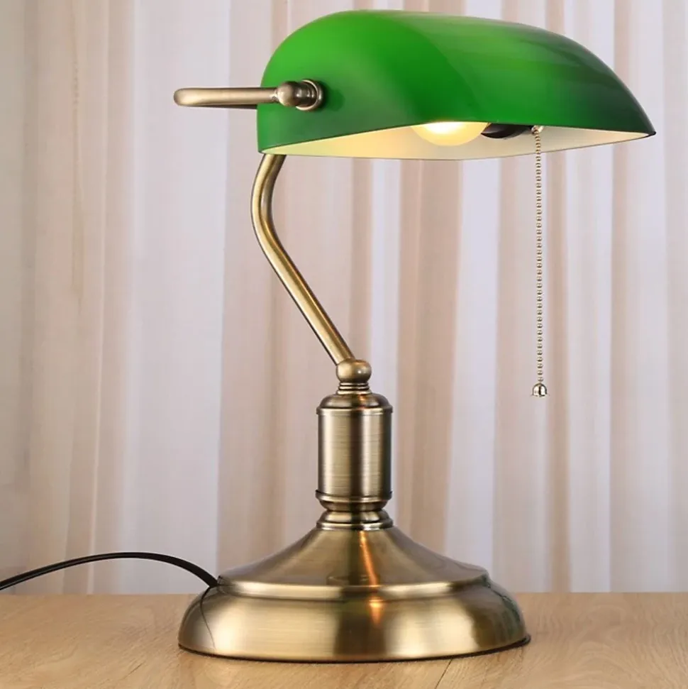 DESIGN VINTAGE ÉLÉGANT – Cette lampe de banquier verte au style vintage des années 20 apporte charme et authenticité à votre intérieur. Parfaite pour salon, chambre, bureau, bibliothèque, mais aussi pour bar, café, studio ou loft, elle crée une ambiance rétro chaleureuse et distinguée.ABAT-JOUR ORIENTABLE – Son abat-jour en verre opaline vert est inclinable pour diriger la lumière exactement là où vous en avez besoin. Idéale comme lampe de lecture, lampe de bureau ou lampe de chevet, elle allie confort visuel et élégance.ALLUMAGE PAR CHAÎNETTE – Système d’allumage authentique à chaînette, typique des lampes de notaire ou d’avocat. Pied feutré intégré pour protéger vos meubles et éviter les rayures, alliant style et praticité.COMPATIBILITÉ E27 – Fonctionne avec toutes les ampoules LED ou standard E27 (non incluses) jusqu’à 60W max, pour un éclairage puissant et adaptable à vos besoins.CARACTÉRISTIQUES – Dimensions : 38 x 26,5 cm. Base en cuivre / laiton brossé, abat-jour en opaline verte. Pied en métal doré galvanoplastie, verre opaline. Garantie 2 ans, design rétro durable et élégant.