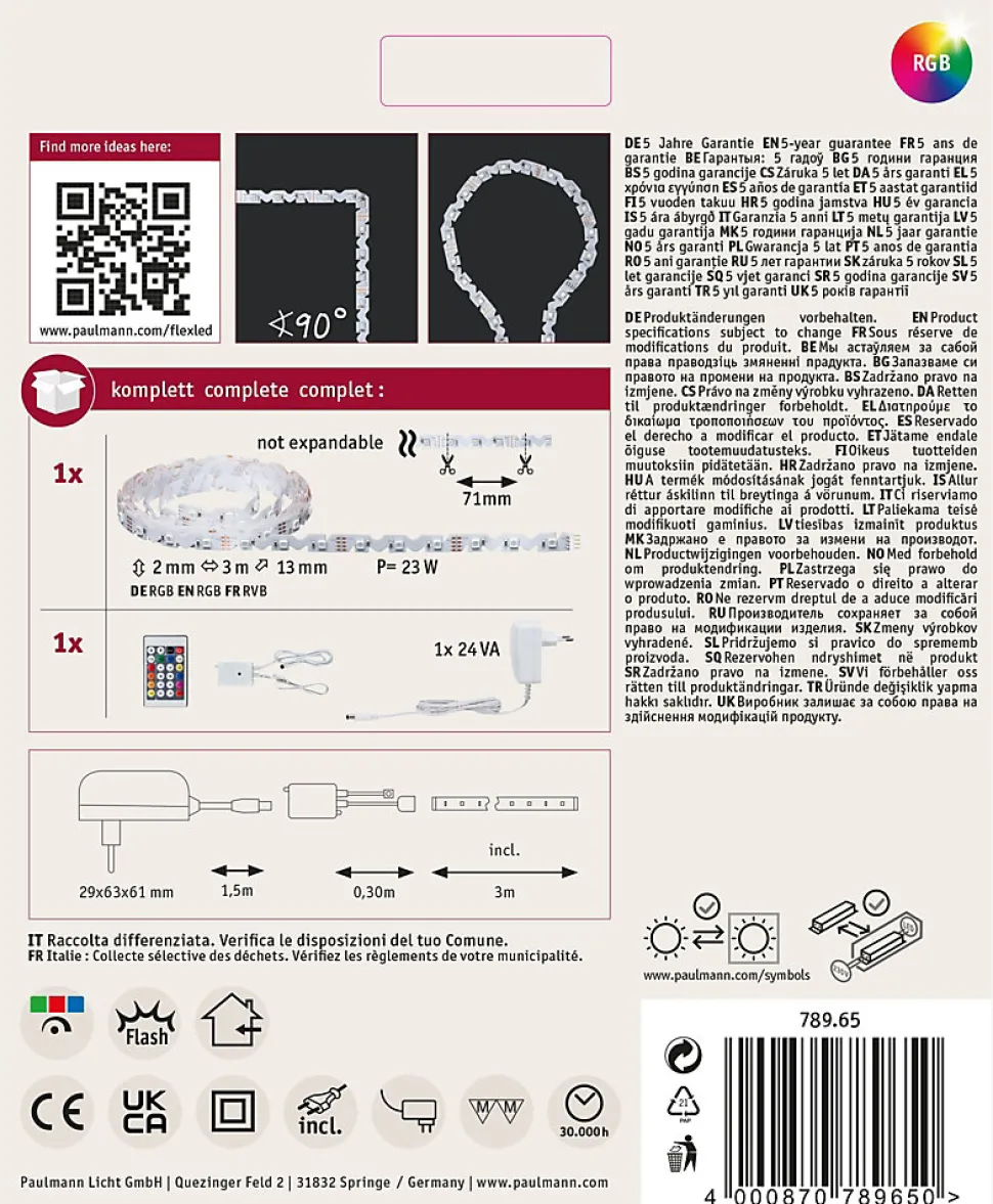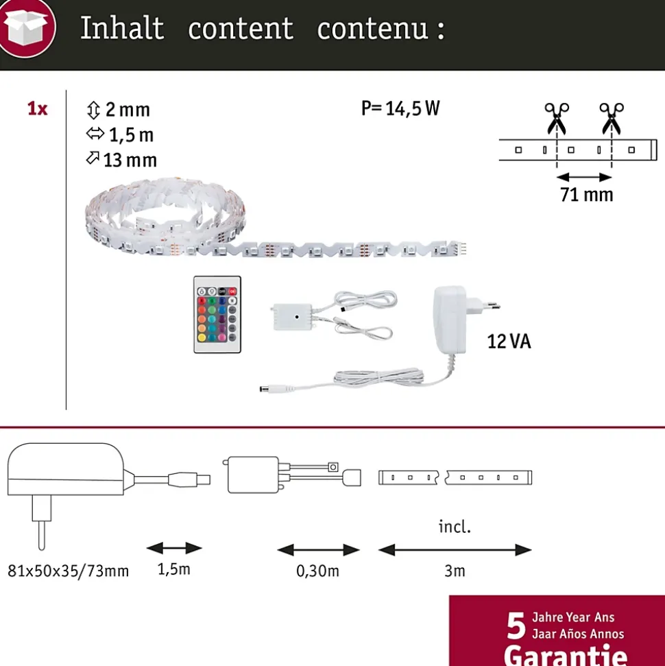 Kit complet avec ruban, alimentation et contrôleur RGB|Fourni avec télécommande pour régler les couleurs et les effets de lumière|Face arrière autocollante pour un montage simple|Peut être raccourci en fonction de la longueur souhaitée (aux endroits marqués)|Aucun accessoire n’est nécessaire|Intensité variable