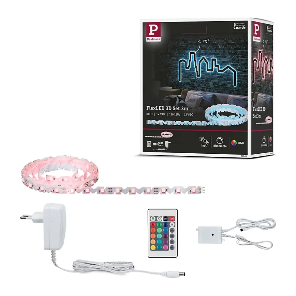 De par leur découpe unique, les strips souples offrent aux bricoleurs de nombreuses possibilités de pose créatives. Ils peuvent être posés en angle à 90° minimum, s’adaptent en trois dimensions aux arêtes et courbes et procurent une image hors du commun. Le kit de base FlexLED RGB d’une longueur de 3 m constitue le meilleur choix de votre prochain projet de bricolage.