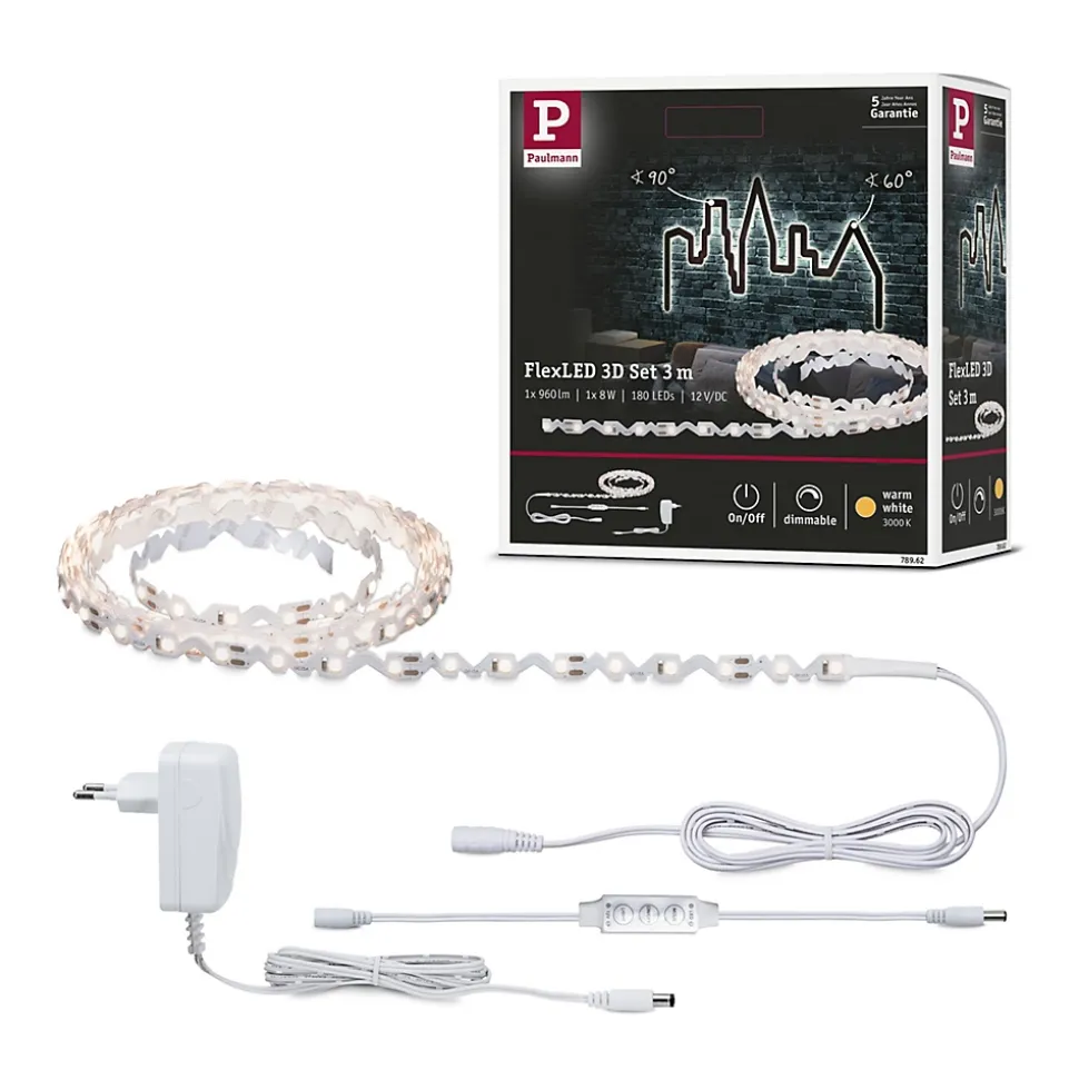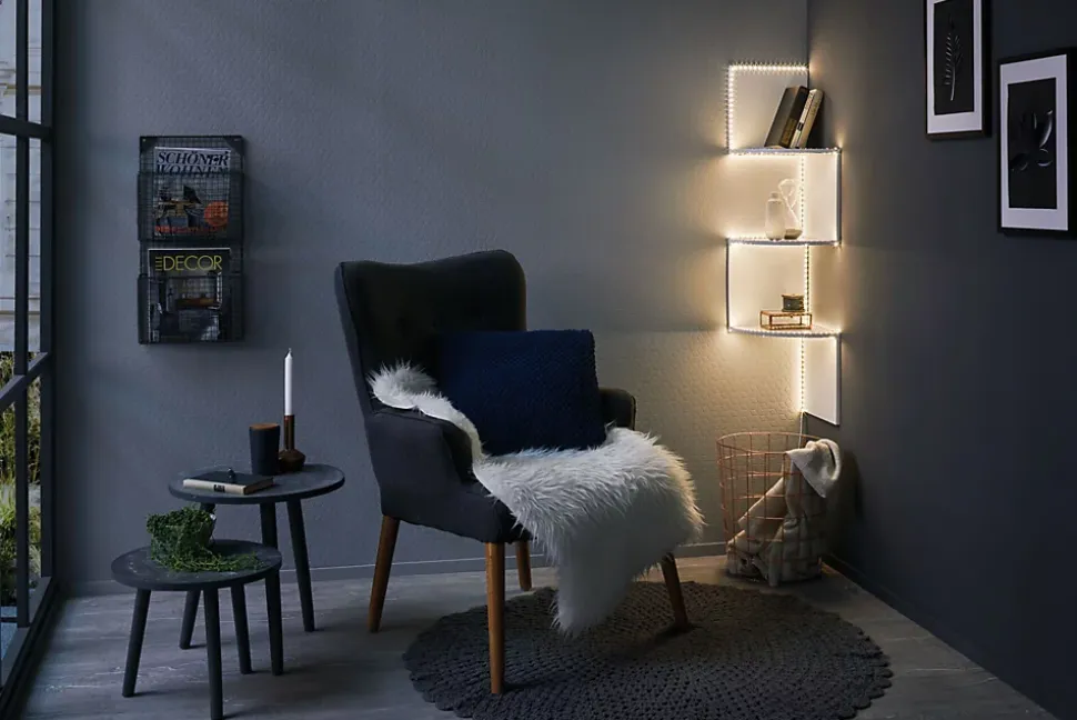 De par leur découpe unique, les strips souples offrent aux bricoleurs de nombreuses possibilités de pose créatives. Ils peuvent être posés en angle jusqu’à 60°, s’adaptent en trois dimensions aux arêtes et courbes et procurent une image hors du commun. Le kit de base FlexLED blanc chaud d’une longueur de 3 m constitue le meilleur choix de votre prochain projet de bricolage.