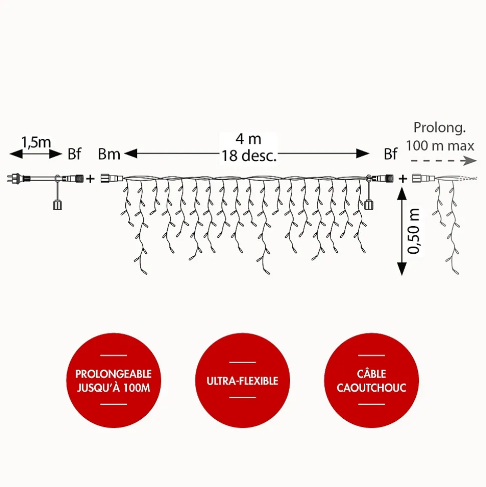 Faites briller vos fênetres ou vitrines avec notre frise lumineuse de qualité professionnelle. 18 descentes pour illuminer vos intérieurs ou extérieurs. • Couleur LED : Blanc chaud• Nb de LED : 100 LED• Nb de descentes : 18• Couleur du câble : Blanc• Animation : Fixe• Dimensions : L4 x H0,5m• Puissance : 9,5W• Tension : 230V• Lumens : 350 lumens• Alimentation : filaire, alimentation incluse. • Prolongeable : jusqu’à 100m maximum• Matière : produit en caoutchouc• Usage : Intérieur/Extérieur• Indice de protection : IP44• Qualité professionnelle• Garantie : 2 ansUsage et installation : De qualité professionnelle, cette frise peut être utiliser aussi bien à l’intérieur qu’à l’extérieur. L’indice IP 44, vous garantit une utilisation extérieure quelque soit la météo tout au long de l’année.Données techniques : Cette frise de 18 descentes est prolongeable jusqu’à 100m maximum. Elle est vendue avec son câble d’alimentation et n’est pas compatible avec nos Plug & Light.Source lumineuse : La frise est composée de 100 LED réparties sur 18 descentes avec un flux lumineux de 350 lumens.Option : disponible en blanc chaud.