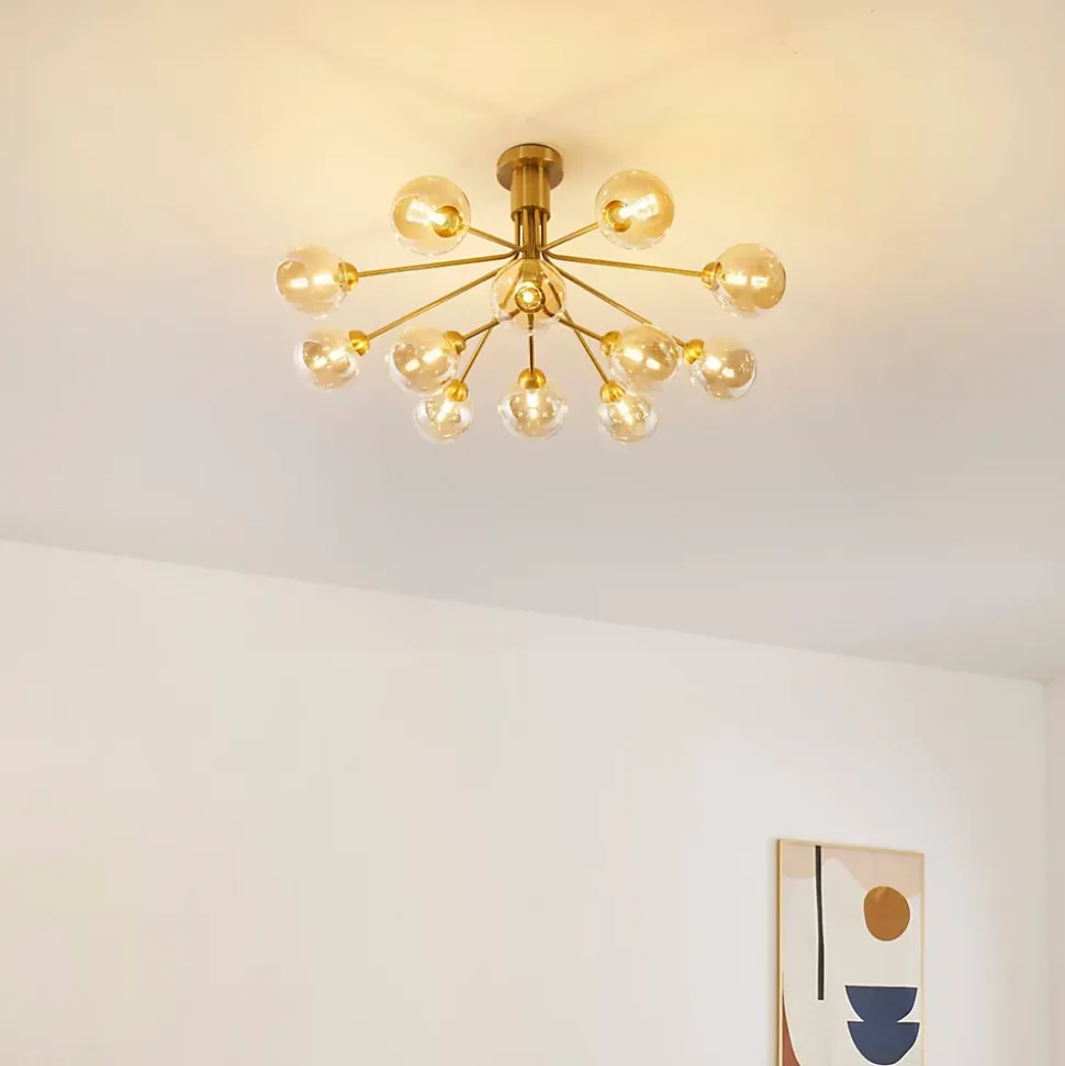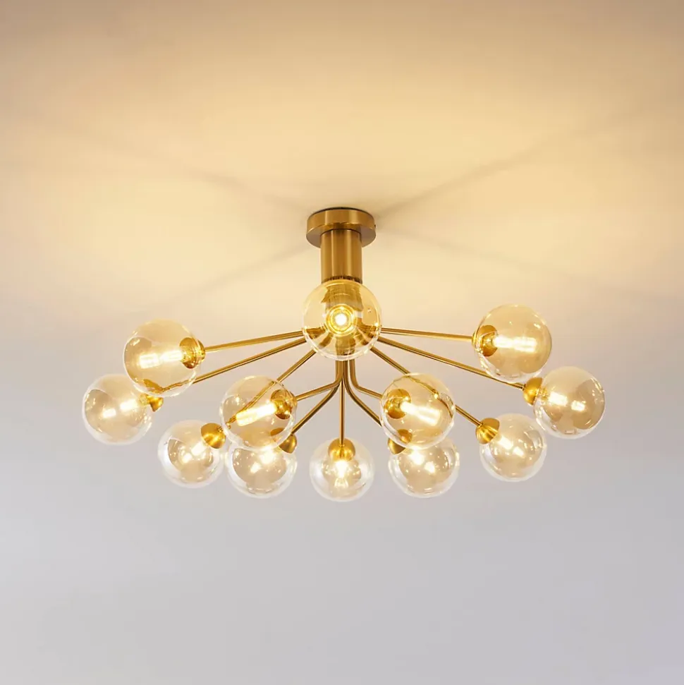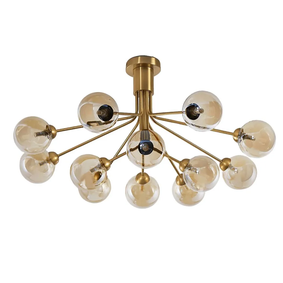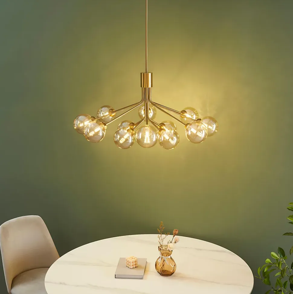 Audrey est une suspension raffinée avec une finition en laiton, mettant en valeur 12 boules ambrées. Pour un éclairage optimal, elle doit être complétée de 12 ampoules G9 (non incluses). Sa hauteur est ajustable, ce qui lui permet de s’adapter à différentes pièces tout en diffusant une lumière généreuse. Son design moderne ajoute une touche de charme et de sophistication, et Audrey peut être transformée en plafonnier en retirant sa barre.) Assemblage à faire par vos soins (