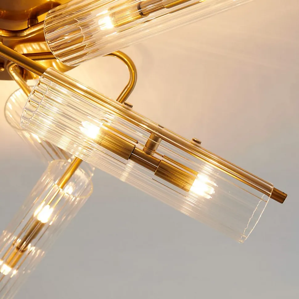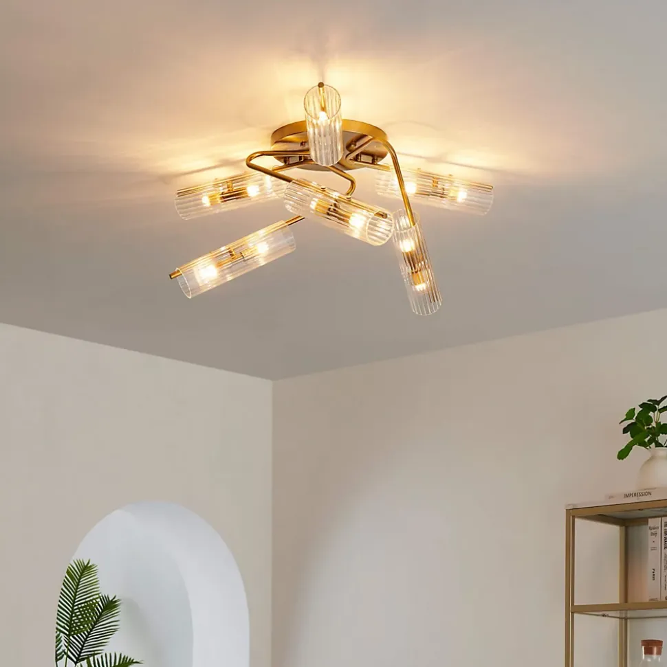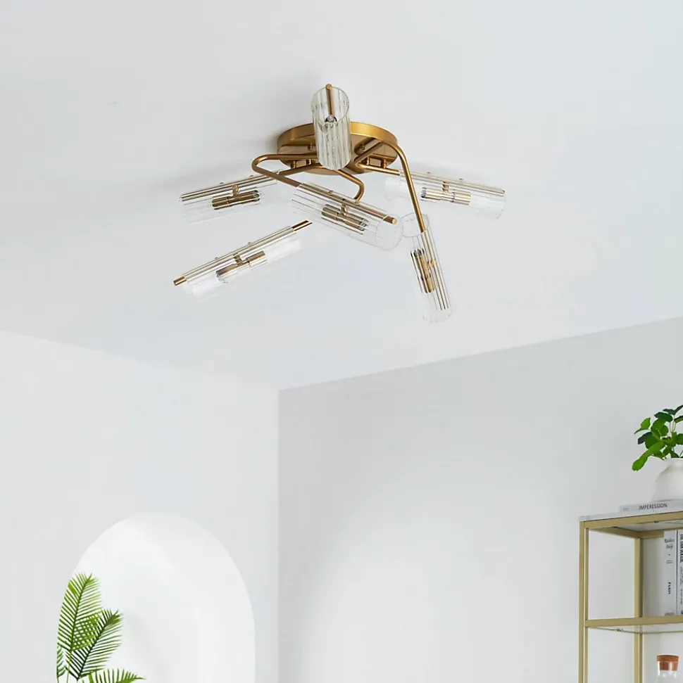 Ajoutez une touche de sophistication à votre intérieur avec le plafonnier Trento. Fabriqué avec du verre et du métal, ce plafonnier se compose de 6 bras en métal surmontés d’abat-jour en verre, chacun abritant 2 ampoules. Sa base ronde assure une fixation solide au plafond. Une fois équipé d’ampoules, ce luminaire offre un éclairage généreux, idéal pour illuminer une grande pièce. Son design unique et sa finition laiton lui confèrent un charme indéniable, faisant de Trento un véritable élément de décoration qui ne passera pas inaperçu dans votre espace.) Assemblage à faire par vos soins (