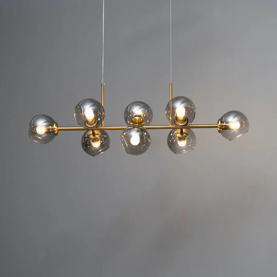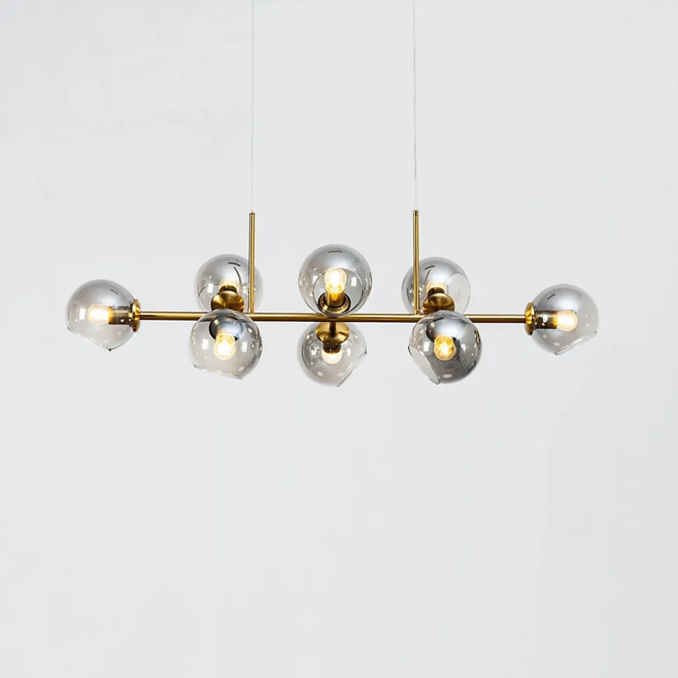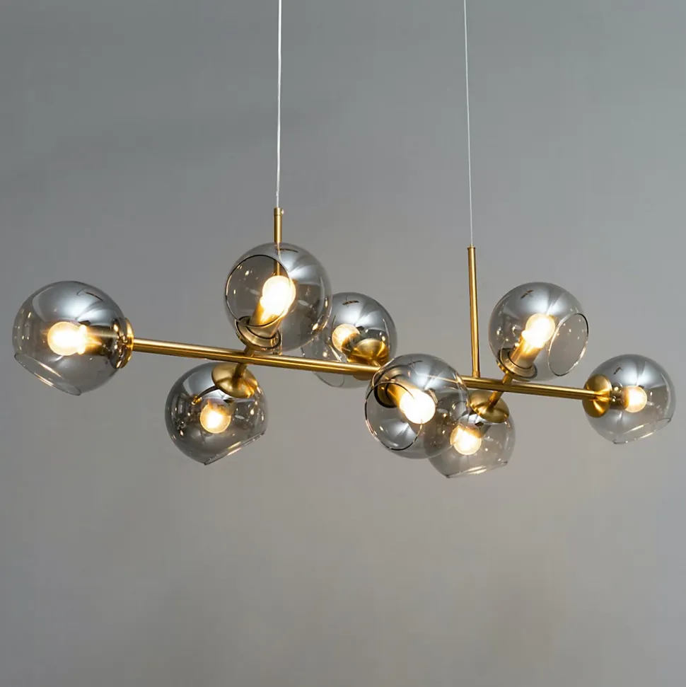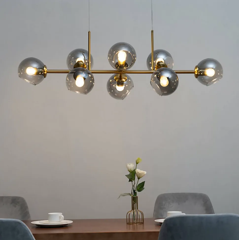 Ajoutez une note moderne et tendance à votre pièce avec la grande suspension Carlotta. Conçue en métal couleur laiton et dotée de sphères en verre fumé, elle mesure 110 cm de long et offre la possibilité d’ajuster sa hauteur. Éclairant de manière homogène avec ses 8 ampoules E27, elle est parfaite au-dessus d’une table ou au centre d’une pièce à vivre. L’association du laiton et des sphères en verre fumé en fait un luminaire décoratif pour une décoration moderne.) Assemblage simple requis (