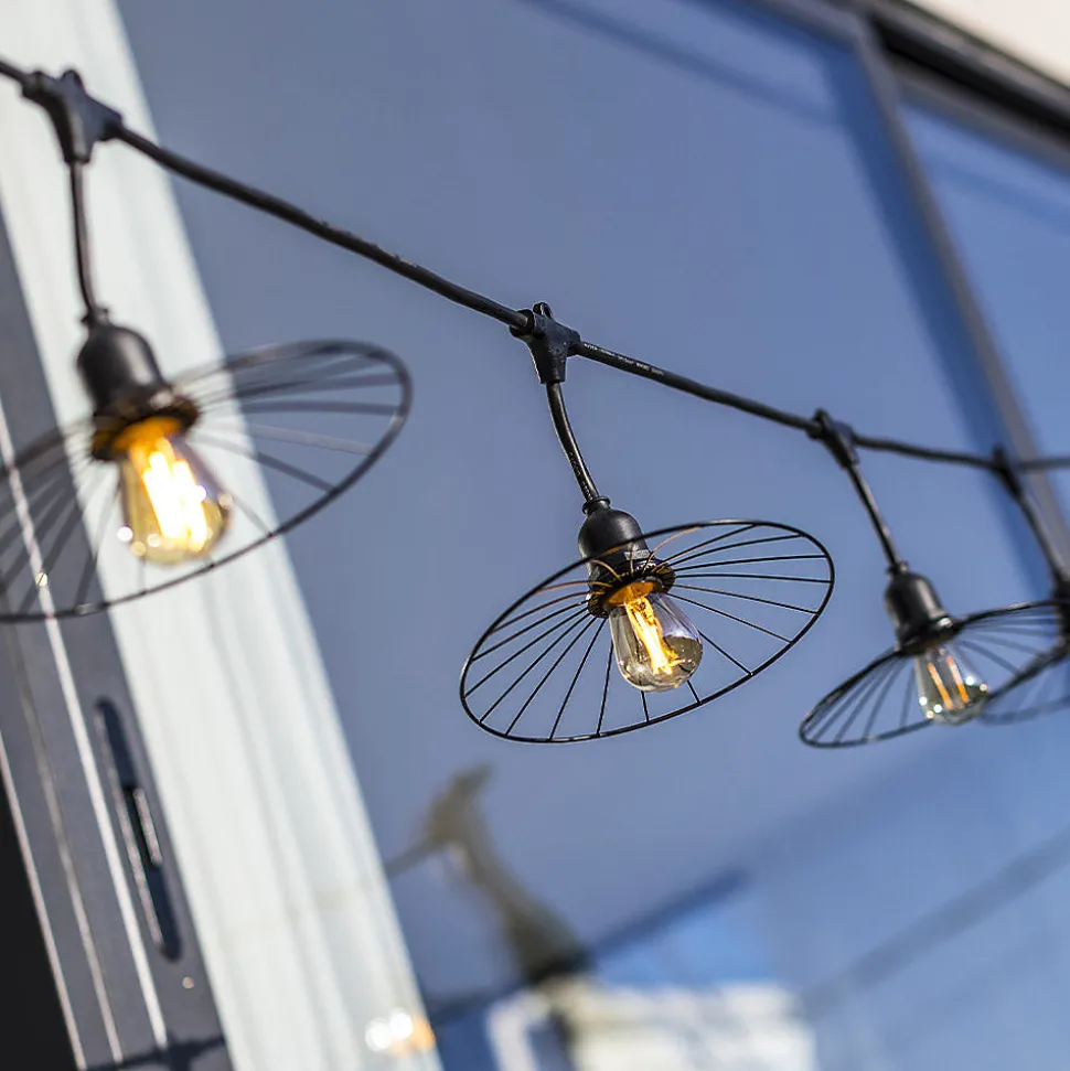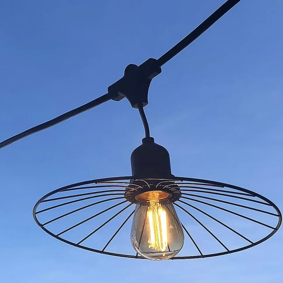 La guirlande extérieure Chic Cage est une solution d’éclairage au style retro et industriel se distinguant par ses 10 élégantes cages en acier. d’une longueur totale de 6 mètres, elle dispose de 10 douilles E27 avec crochets de suspension intégrés pour une installation simple et rapide. Ce modèle est livre sans ampoule, vous offrant la liberte de choisir votre type d’éclairage (LED maximum 25W par culot). Son design vintage et moderne s adapte parfaitement a la décoration de vos terrasses, jardins ou salons. Grace a sa protection IP44 contre les éclaboussures et sa résistance aux rayons UV, elle assure une utilisation durable en extérieur comme en intérieur. Pratique, cette guirlande est raccordable, permettant de connecter plusieurs unités pour couvrir de plus grandes surfaces. Avec un cable de 2 mètres avant la première douille et un espacement de 40 cm entre chaque cage, elle apporte une touche design et chaleureuse a tous vos espaces de vie avec une grande flexibilité.