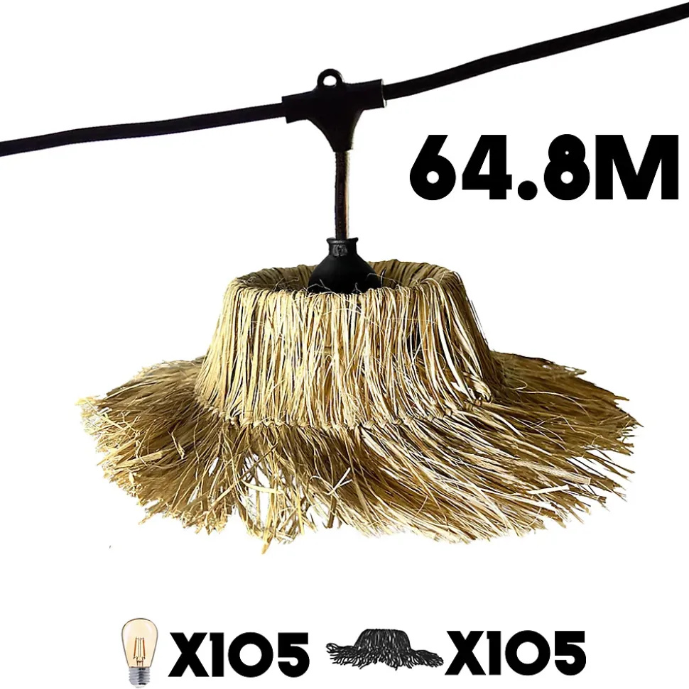 Ce lot de 15 guirlandes Tahiti Light Connectable de 64, 8 mètrès incarne le style bohème et naturel. Ses abat-jours en paille apportent une touche exotique authentique, idéale pour sublimer des lieux professionnels comme des restaurants, hôtels ou vastes espaces de réception. Son système raccordable permet de relier les 15 unités pour couvrir de très grandes surfaces sur une seule prise secteur, répondant aux exigences de l’événementiel d’envergure. Polyvalente, elle est certifiée IP64 pour un usage sécurisé en intérieur comme en extérieur, résistant aux éclaboussures et aux UV. Équipée de 105 ampoules LED à filament blanc chaud, elle diffuse une lumière douce et esthétique, créant une atmosphère conviviale et tropicale. Sa conception robuste garantit une décoration pérenne sur vos terrasses ou dans vos jardins. Ce kit complet combine l’esthétique des fibres naturelles avec une performance technique optimale pour transformer vos grands espaces avec un charme chic unique.