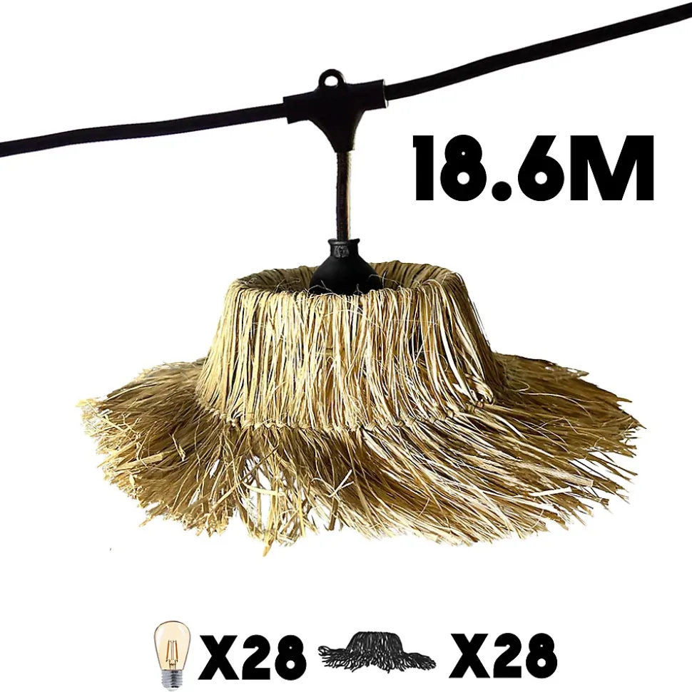 Ce lot de 4 guirlandes Tahiti Light Connectable de 18, 6 mètrès incarne un style bohème naturel et authentique. Ses abat-jours en paille apportent une touche exotique, idéale pour sublimer des restaurants, hôtels ou grands événements. Grâce à son système raccordable, ce kit permet de couvrir de vastes surfaces en reliant plusieurs unités sur une seule prise, répondant parfaitement aux exigences professionnelles. Polyvalente, elle est certifiée IP64 pour un usage sécurisé en intérieur comme en extérieur, résistant aux éclaboussures et aux UV. Équipée de 28 ampoules LED à filament blanc chaud, elle diffuse une lumière douce et élégante, créant une atmosphère conviviale et tropicale. Sa conception robuste avec des matériaux de qualité garantit une décoration pérenne sur vos terrasses ou dans vos espaces commerciaux. Ce pack de 4 unités combine esthétique bohème chic et performance technique pour transformer durablement vos grands volumes avec charme et fiabilité.