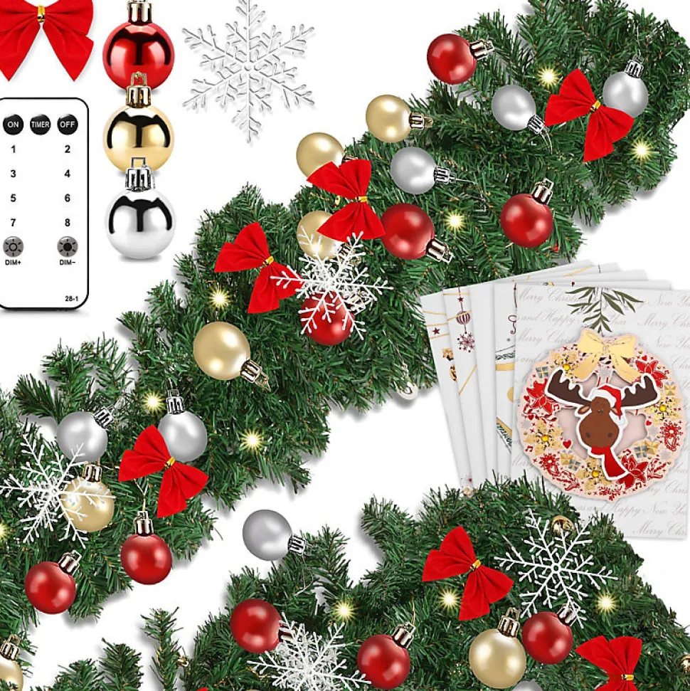 Guirlande lumineuse de Noël 10 mLa guirlande lumineuse de Noël de 10 m, dotée de 200 LED blanc chaud, crée une ambiance festive pour vos espaces intérieurs et extérieurs. Grâce à ses branches de sapin artificielles flexibles, ses 860 pointes modulables et ses nombreux accessoires, elle est idéale pour décorer escaliers, portes, balcons ou tables. Décoration de Noël éléganteGuirlande artificielle de 10 m de long avec 200 LED blanc chaudCrée une ambiance chaleureuse et festiveConvient à une utilisation intérieure et extérieureIndice de protection IP44 – résistante aux éclaboussures et aux intempériesIdéale pour les escaliers, les portes, les balcons ou les encadrements de fenêtresDesign flexible860 branches flexibles pour créer des formes personnaliséesRésistante et facile d’entretien pour de nombreuses saisonsNombreux accessoires10 nœuds, 10 flocons de neige et 36 boules de Noël inclusDécorez selon vos envies – style classique ou moderneContrôle pratiqueTélécommande avec minuterie et 7 modes d’éclairageLumière blanc chaud pour une ambiance chaleureuseDonnées techniques:Nombre de boules :12 dorées, 12 rouges, 12 argentéesDiamètre des boules : 3 cmCouleur : VertFonctions de la télécommande : 7 effets lumineuxInterrupteur marche/arrêtRéglage de la luminositéMinuteriePoids avec emballage : 5 kgInclus : 5 cartes de Noël10 cristaux de glace10 rubans rouges36 boules de NoëlTélécommande200 LED blanc chaudLongueur du câble d’alimentation : 10mLongueur totale : 10mIndice de protection : IP44Utilisation prévue : Intérieur et ExtérieurSupport client et SAV en Français – Pas de livraison dans le DOM TOM et la Corse.
