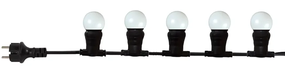 Guirlande LED de qualité professionnelle – idéale pour une ambiance guinguetteLongueur de la guirlande : 10 mètres. Cette guirlande est équipée de 10 ampoules blanches prêtes à l’emploi (fournies). Puissance d’éclairage : 500 lumens. Forme des ampoules : sphérique. Technologie : LED. Température d’éclairage : blanc chaud 3000Kelvins. Type de culot : Ampoule B22, 230V, durée de vie 30 000h. Guirlande à utiliser à l’intérieur comme à l’extérieur, été comme hiver. Idéale pour décorer et illuminer une terrasse, un jardin ou une pergola. Alimentation 230V ~50Hz. Câble noir H07RN-F 2×1.5mm². Classe II. IP44: protégé contre les projections d’eau de toutes directions. * Longueur (en cm): 1000 * Nom du produit: Guirlande * Nombre de lumières: 10 ampoules B22 fournies * Objet connecté: Non * Puissance consommée par ampoule fournie (en W): 0.8 * Puissance maximum par lumière (en W): 15 * Tension (en V): 230 * Type d’ampoule: LED * Ampoule fournie: Oui * Puissance (en lumen): 500 * Indice de protection (ip + ik): IP44 * Classe de protection: 2 : appareil électrique avec double isolation * Produit emballé : hauteur (en cm): 25 * Produit emballé : largeur (en cm): 20 * Produit emballé : profondeur (en cm): 16 * Produit emballé : poids (en kg): 1.813 * Garantie constructeur (en années): 2 * Classe énergétique (A++ à E): A++ * Marque du produit: TIBELEC * Type de produit: Extérieure * Fabrication « Union Européenne »: Non
