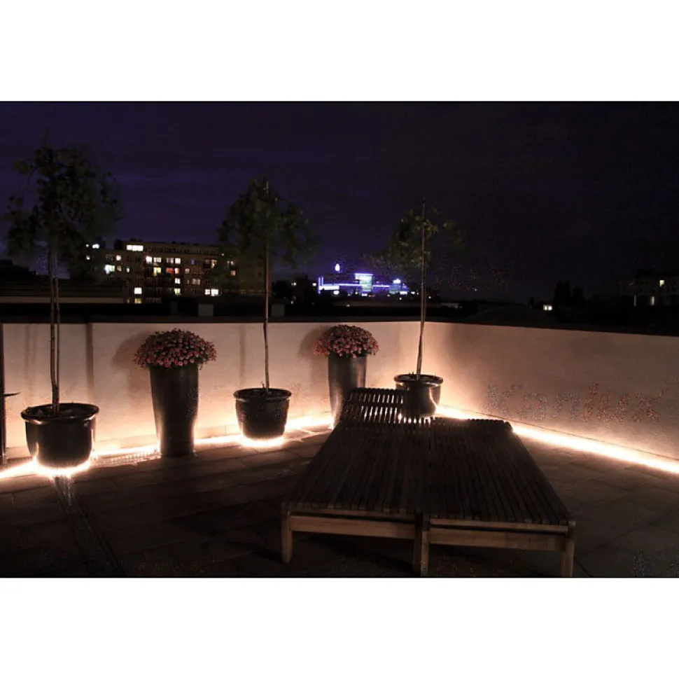 Les caractéristiques techniquesCette guirlande lumineuse peut être installée aussi bien à l’intérieur qu’à l’extérieur grâce à son coefficient d’étanchéité IP65.La partie éclairante mesure 30 mètres et le câble d’alimentation 1,5 mètre.Elle diffuse une lumière blanc chaud.Cet élément décoratif est également économique puisqu’il en consomme que 30 watts pour 3300 lumens d’éclairage.Cette guiralnde est ivrée avec son cordon d’alimentation (ref 38590) étanche également (IP44)Les avantages esthétiques Cette guirlande lumineuse décorative embellira aussi bien votre intérieur que votre extérieur car elle est étanche.En été, vous donnerez un aspect festif à votre terrasse ou votre jardin.Pour vos evènementiels en extérieur (mariage, fêtes de famille etc) cette guirlande décorative amènera de la magie à la soirée.A l’intérieur, vous pourrez entourer une rampe d’escalier ou une rambarde de mezzanine.La guirlande est livrée en bobine. Elle existe également en version 15 mètres. Vous pouvez relier ensemble plusieurs guirlandes (jusqu’à 100 métres).