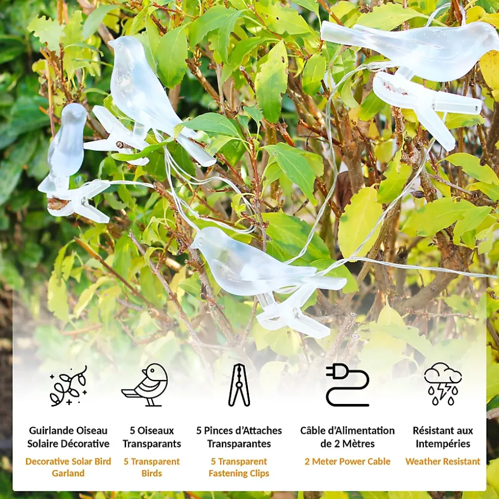 – ESTHETIQUE : La guirlande lumineuse est agrémentée d’oiseaux s’éclairant de l’intérieur, cette guirlande vous permet de décorer et d’embellir votre interieur et/ou votre extérieur tout le long de l’année mais aussi durant les périodes de fêtes de fin d’année – POLYVALENT : La guirlande lumineuse est un modèle qui est possible d’installer à l’intérieur comme à l’extérieur de votre maison, ce qui vous permet de décorer votre maison sans donner de limite à votre imagination et votre créativité – CONSOMMATION : La guirlande est équipé d’un panneau solaire permettant de recharger la guirlande durant la journée et d’éclairer votre intérieur/extérieur durant la soirée tout en consommant intelligement grâce à son détecteur de luminosité intégré – PRATIQUE : La guirlande est agrémentée de pince transparente pour chaque oiseaux permettant une installation facile et rapide, les pinces sont de matière transparentes permettant de garder le côté naturel des oiseaux et de garder l’ésthétisme de la guirlande – NORMES : La guirlande est agrémentée de plusieures normes confirmant la qualité et la conformité de la guirlande, la norme CE est la norme qui correspondant aux exigences de qualités et de restrictions des normes Européennes, La norme RoHS affirme de l’absence de produit chimique ou dangereux présent dans le produit qui peuvent nuire à la santé et/ou à l’environnement