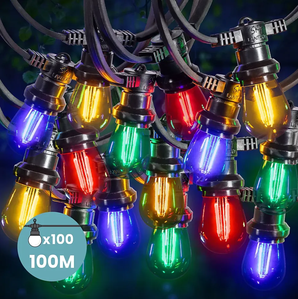 La touche de couleur qui transforme votre chez-vous Transformez votre espace en un lieu féerique avec notre Guirlande Guinguette de 100 mètres; équipée de 100 ampoules LED filament multicolores (jaune; bleu; vert et rouge)Créez une ambiance lumineuse magique en un instant grâce à notre guirlande guinguette LED multicoloreL’effet rustique-moderne de cette guirlande apporte une touche d’élégance intemporelle à votre intérieur ou extérieurEnveloppez vos soirées d’une atmosphère tamisée et intime; idéale pour des moments romantiquesPour des événements spéciaux comme des mariages ou des anniversaires; laissez la magie opérer avec un éclairage éclatant qui illuminera chaque coin de mille feuxCette guirlande lumineuse est l’élément clé pour créer une ambiance magique et lumineuse; que ce soit chez vous ou lors d’occasions spécialesDisponible en longueurs allant jusqu’à 50 mètres; vous pouvez choisir la taille parfaite pour enchanter n’importe quel lieuCaractéristiques Techniques : Contenu du colis : 10 guirlandes guinguette et 100 ampoules led filament multicolores Longueur de la Guirlande : 10m Nombre de Bulbe : 100 Type d’Ampoule : Double Filament LED Dimensions de l’ampoule : 45x85mm Forme de l’Ampoule : Allongée/Goutte d’eau Matière de l’ampoule : PVC Durée de vie de l’ampoule : +30 000 heures Culot E27 Lumen : 190 Température de Couleur : 2800 Kelvins Puissance de l’ampoule : 1;5W Certification CE et RoHS