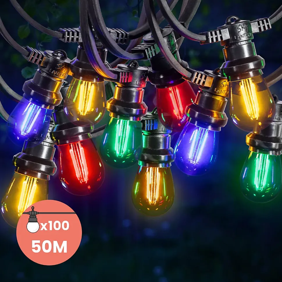 La touche de couleur qui transforme votre chez-vous Transformez votre espace en un lieu féerique avec notre Guirlande Guinguette de 50 mètres; équipée de 100 ampoules LED filament multicolores (jaune; bleu; vert et rouge).Créez une ambiance lumineuse magique en un instant grâce à notre guirlande guinguette LED multicolore. L’effet rustique-moderne de cette guirlande apporte une touche d’élégance intemporelle à votre intérieur ou extérieur. Enveloppez vos soirées d’une atmosphère tamisée et intime; idéale pour des moments romantiques. Pour des événements spéciaux comme des mariages ou des anniversaires; laissez la magie opérer avec un éclairage éclatant qui illuminera chaque coin de mille feux.Cette guirlande lumineuse est l’élément clé pour créer une ambiance magique et lumineuse; que ce soit chez vous ou lors d’occasions spéciales. Disponible en longueurs allant jusqu’à 50 mètres; vous pouvez choisir la taille parfaite pour enchanter n’importe quel lieu.Caractéristiques Techniques : Contenu du colis : 5 guirlandes guinguette et 100 ampoules led filament multicolores Longueur de la Guirlande : 50m Nombre de Bulbe : 100 Type d’Ampoule : Double Filament LED Dimensions de l’ampoule : 45x85mm Forme de l’Ampoule : Allongée/Goutte d’eau Matière de l’ampoule : PVC Durée de vie de l’ampoule : +30 000 heures Culot E27 Lumen : 190 Température de Couleur : 2800 Kelvins Puissance de l’ampoule : 1;5W Certification CE et RoHS