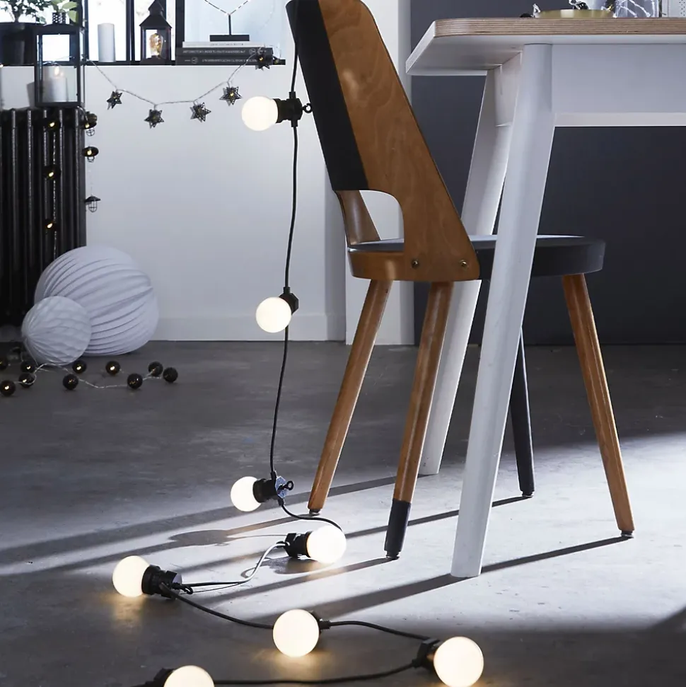 Retrouver l’authentique esprit de la guinguette chez vous ! Pour vos douces soirées d’été ou tous vos évènements qui vous tiennent à cœur; apportez l’esprit guinguette à votre décoration en installant la guirlande guinguette blanche 6 mètres. La déco de votre soirée en sera d’autant plus chaleureuse est conviviale que vous l’installiez dans les arbres de votre jardin; au plafond de votre salle de réception ou que vous la suspendiez d’un mur à l’autre. Vous pourrez également compléter votre déco avec des boules japonaises qui s’accordent parfaitement à l’authenticité de la guinguette. Créez le décor de vos rêves en choisissant d’installer la guirlande lumineuse guinguette bulbes blancs seule ou en la raccordant à quelques compléments de guirlande guinguette blanche; multicolore ou transparente SkyLantern ! Afin de brancher votre complément; vous devrez d’abord retirer le bouchon présent sur l’embout de la guirlande guinguette en le dévissant dans le sens inverse des aiguilles d’une montre. Les crochets présents au-dessus des bulbes vous faciliteront la vie pour l’installation de la guirlande. Enfin; il vous suffit de raccorder la guirlande au transformateur et de brancher celui-ci. Si besoin; vous pouvez également utiliser le câble rallonge pour un branchement plus simple. Les guirlandes guinguette Skylantern répondent aux normes CE et IP44 qui leur permettent d’être sécurisées; résistantes aux projections d’eau et de poussière. Il est conseillé de ranger ces guirlandes lors de la période hivernale afin de préserver leur durée de vie. Les bulbes sont également solides et très résistants. Un transformateur et un câble rallonge sont inclus dans ce pack.N’hésitez plus; la guirlande guinguette est l’objet tendance du moment à intégrer dans toutes vos décorations !