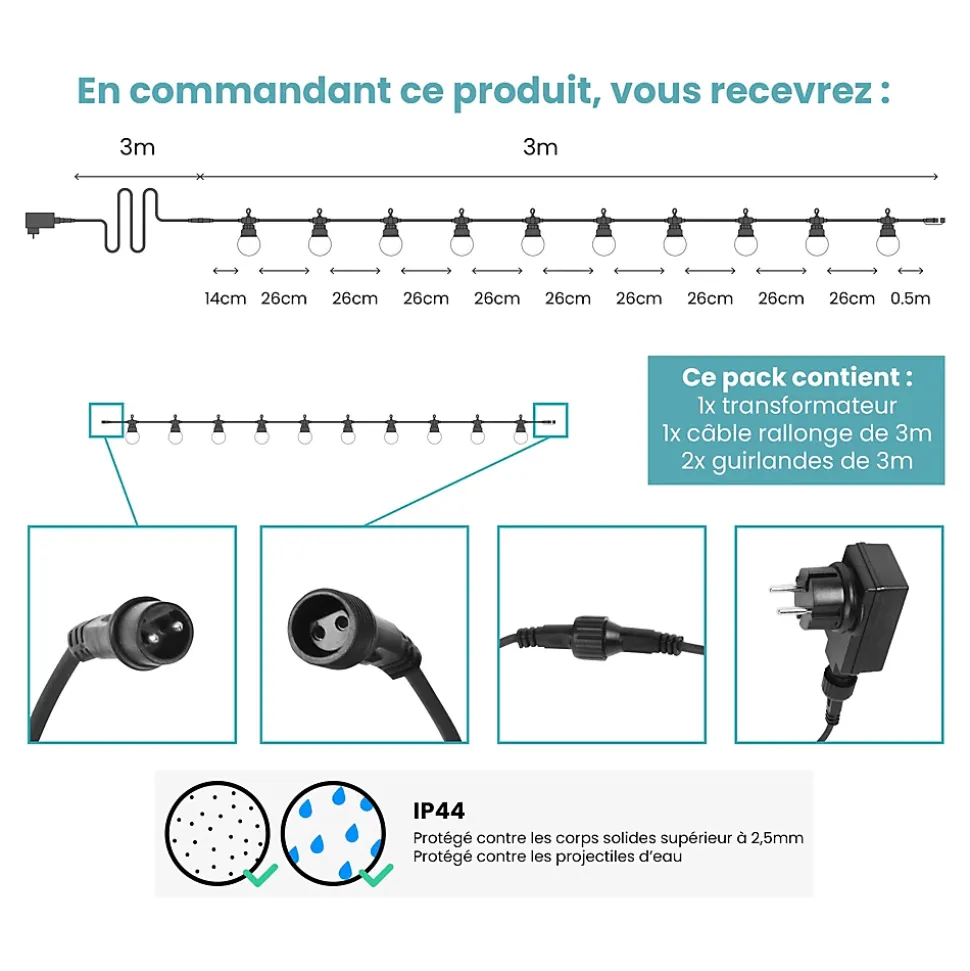 - ✅ ETANCHE IP44 ET SECURITE : Les ampoules de notre guirlande guinguette sont étanches aux normes IP44