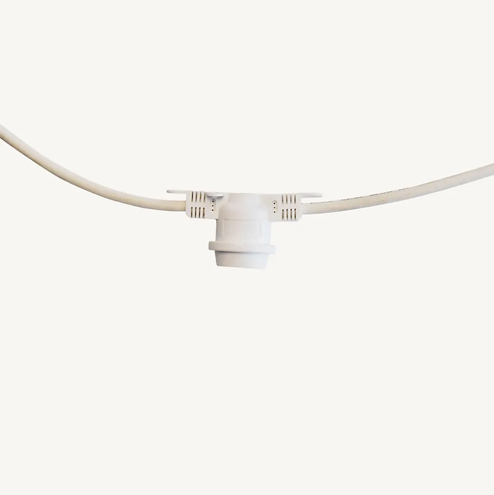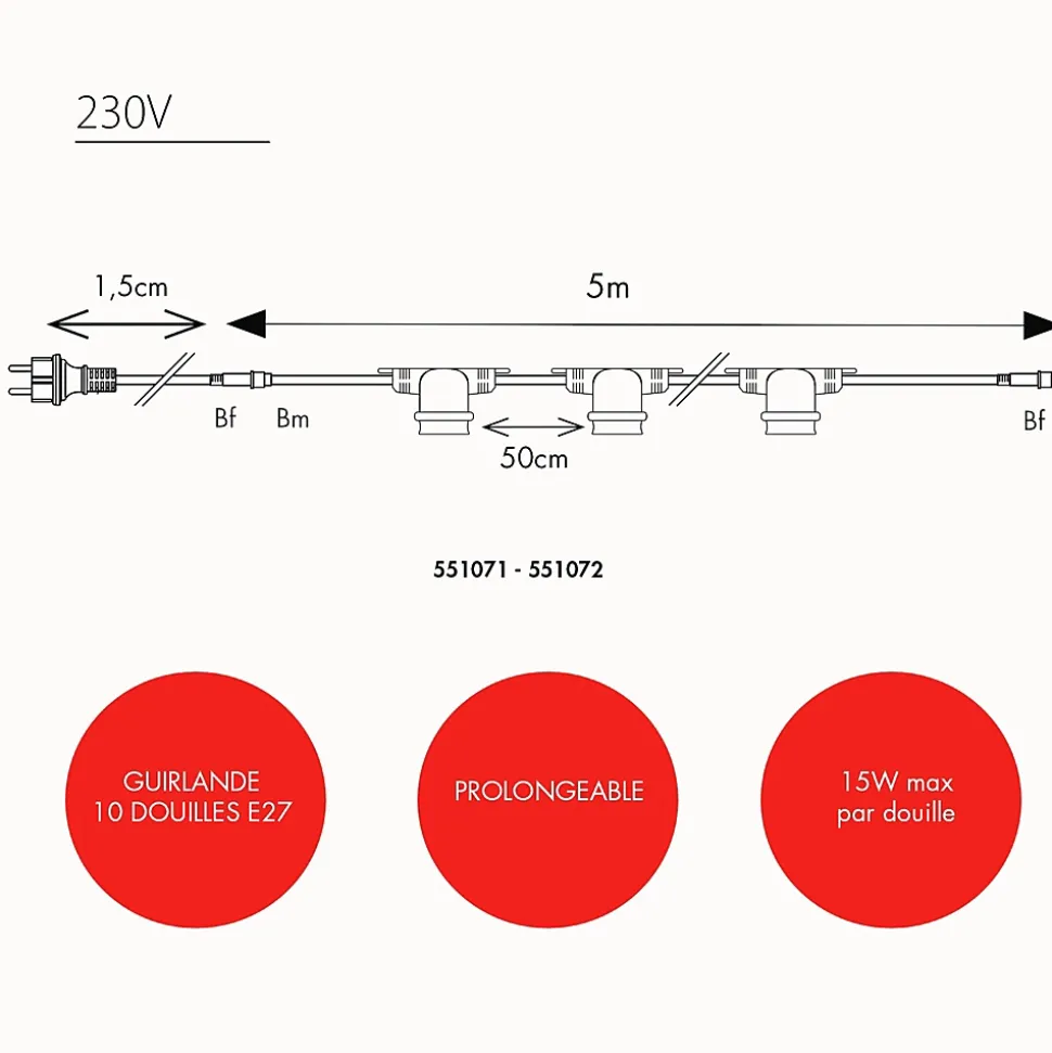 Apportez une touche festive à vos extérieurs grâce à cette authentique guirlande guinguette. Prolongeable jusqu’à 100m, elle vous permettra de créer un plafond ou de redessiner une pergola comme un vrai décorateur. Qualité professionnelle ! Ajoutez les ampoules de votre choix• Type de douilles : E27• Nb de douilles : 10 douilles E27 de 15W max• Dimensions : L5m• Prolongeable : jusqu’à 100m• Usage : Intérieur/Extérieur• Indice de protection: IP44• Alimentation : Sur secteur, inclue• Puissance : 15W max par douille• Tension : 230V• Couleur du câble : câble blanc• Matière : Caoutchouc• Qualité professionnelle• Garantie : 2 ansUsage et installation : Son indice IP 44 vous garantit une utilisation extérieure quelque soit la météo tout au long de l’année. Elle peut servir de décoration sur une terrasse, votre balcon ou bien dans un bar, un restaurant, un camping. Chaque douille est équipée de 4 anneaux de fixation afin de faciliter son installation.Données techniques : La guirlande mesure 5m de longeur. Elle contient 10 douilles E27. Chaque douille est équipée d’un joint d’étanchéité. les guirlandes sont vendues sans ampoule. Elles supportent 15W maximum par douille. Il y a 4 anneaux de fixations sur chaque douille. Les guirlandes sont prolongeables jusqu’à 100m.Source lumineuse : Le guirlande est composée 10 douilles E27. Les ampoules ne sont pas inclues.