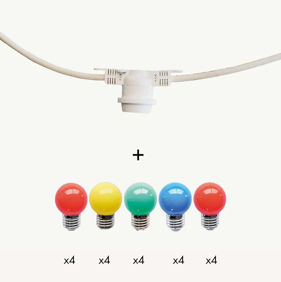 Créez une ambiance digne des bals Ménilmontant et apportez une touche festive à vos extérieurs avec ce kit de guirlande guinguette composé d’une guirlande câble blanc de 10m, 20 douilles et de 20 ampoules E27 Jaune, rouge, vert, bleu et rose ! Indémodable ! Qualité professionnelle!• Type de douille : E27• Nb d’ampoules : 20 ampoules forme G45• Couleur de LED : Multicolore : Jaune, rouge, vert, bleu et rose• Nb de douilles : 20 douilles avec ampoule• Dimensions : L10m• Couleur du câble : Blanc• Prolongeable : jusqu’à 100m• Usage : Intérieur/Extérieur IP44• Alimentation : Sur secteur, inclue• Puissance : 10W• Tension : 230V• Matière : Caoutchouc• Qualité professionnelle• Garantie : 2 ansUsage & installation :Son indice IP44 vous garantit une utilisation extérieure quelque soit la météo tout au long de l’année. Créez un plafond ou redessinez une pergola comme un vrai décorateur. Elle peut servir de décoration sur une terrasse, votre balcon ou bien dans un bar, un restaurant ou un camping.Données techniques & dimensions :Ce kit est composé de la guirlande guinguette Festival 551074 et de 4 lots d’ampoules 550191 soit 8 ampoules rouges, 4 ampoules jaunes, 4 ampoules vertes et 4 ampoules bleues, douille E27 forme G45. C’est à vous d’assembler les ampoules. Sa puissance est de 10W. La guirlande mesure 10m, elle est prolongeable jusqu’à 100m. Elle est vendue avec des ampoules. Son câble est blanc. Chaque douille est équipée d’un joint d’étanchéité et supporte 15W.Source lumineuse :Chaque douille supporte 15W max. L’ampoule E27 est fabriquée en polycarbonate, elle est donc incassable. Les LED sont à faible consommation d’énergie. Les ampoules hautes luminosité vous garantissent un éclairage optimal pour vos soirées d’été.