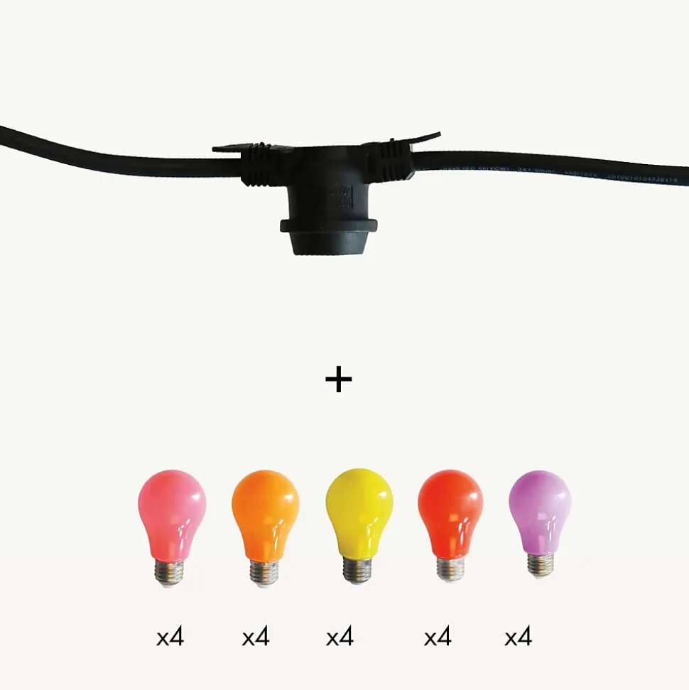 Créez une ambiance digne des bals Ménilmontant et apportez une touche festive à vos extérieurs avec ce kit de guirlande guinguette composé d’une guirlande câble noir de 10m, 20 douilles et de 20 ampoules E27 Jaune, rouge, orange, violet et rose ! Indémodable ! Qualité professionnelle!• Type de douille : E27• Nb d’ampoules : 20 ampoules forme A60• Couleur de LED : Couleurs chaudes : Jaune, rouge, orange, violet et rose• Dimensions : L10m• Couleur du câble : Noir• Prolongeable : jusqu’à 100m• Usage : Intérieur/Extérieur IP44• Alimentation : Sur secteur, inclue• Puissance : 50W• Tension : 230V• Matière : Caoutchouc• Qualité professionnelle• Garantie : 2 ansUsage & installation :Son indice IP44 vous garantit une utilisation extérieure quelque soit la météo tout au long de l’année. Créez un plafond ou redessinez une pergola comme un vrai décorateur. Elle peut servir de décoration sur une terrasse, votre balcon ou bien dans un bar, un restaurant ou un camping.Données techniques & dimensions :Chaque douille supporte 15W max. L’ampoule E27 est fabriquée en polycarbonate, elle est donc incassable. Les LED sont à faible consommation d’énergie. Les ampoules haute luminosité vous garantissent un éclairage optimal pour vos soirées d’été.Source lumineuse :Chaque douille supporte 15W max. L’ampoule E27 est fabriquée en polycarbonate, elle est donc incassable. Les LED sont à faible consommation d’énergie. Les ampoules haute luminosité vous garantissent un éclairage optimal pour vos soirées d’été.