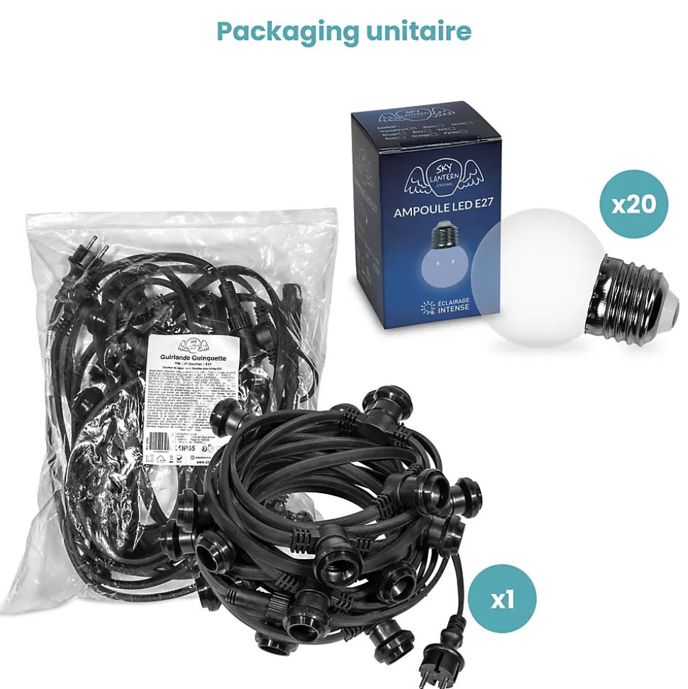 - ECLAIRAGE INTENSE : Notre guirlande guinguette possède 20 bulbes pour 10M de câble ! Grâce aux 8 Leds par bulbes, ses 2700 Kelvins et 100 Lumens, obtenez un éclairage époustouflant ! Changez le style de votre guirlande selon vos envies grâce à nos bulbes remplaçables (compatible avec bulbes E27 SkyLantern) !