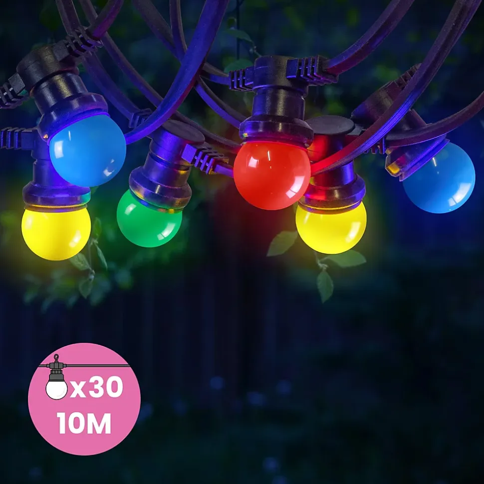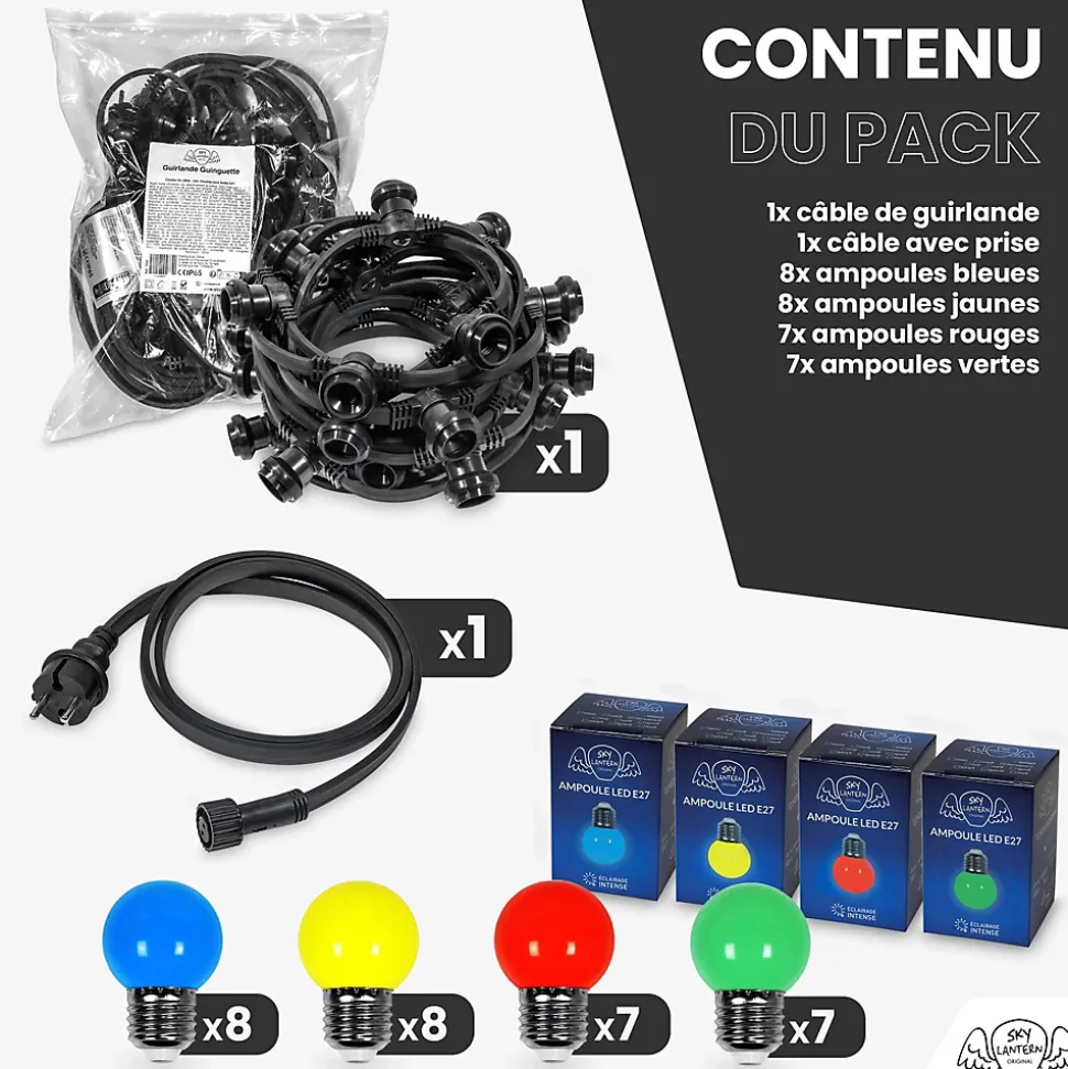Des bulbes éclatants; une lumière intense ! La guirlande guinguette; l’incontournable tendance revient une fois de plus sur le devant de la scène pour vous proposer un nouveau modèle.Ce nouveau modèle disponible en différentes tailles; 10; 20; 30; 50Elle est disponible dans nos 3 coloris : blanc; transparent et multicolore !Cette guirlande de grande longueur est totalement adaptée à un usage extérieur à l’année grâce à sa spécification IP65 (résistance maximum à l’eau et à la poussière)La spécificité de notre nouvelle guirlande est le nombre de bulbes par guirlande ! Nous avons depuis toujours proposé des guirlandes de 10M possédant 10 BulbesAujourd’hui; nous vous proposons le triple! Les guirlandes guinguette de 10M pour 20 bulbes lumineux! Obtenez un extérieur féerique sous la lumière de nos bulbes ! Plus qu’une ambiance guinguette; créez un moment festif entre famille et amis ! Ce kit comprend 1 guirlande guinguette de 10 mètres et 30 bulbes LEDs multicolores dotés de 8 LEDs chacuneL’utilisation d’un module de 8 leds par bulbe permet un éclairage intense sur chaque bulbeCes bulbes sont remplaçables (culot E27)Toutes nos Guirlandes Guinguettes sont garanties 2 ansImportant : Il est recommandé de bien visser les ampoules à fond dans le culot afin de garantir une étanchéité parfaite aux intempériesAstuce: Si votre ampoule ne s’allume pas c’est qu’il faut encore visser !