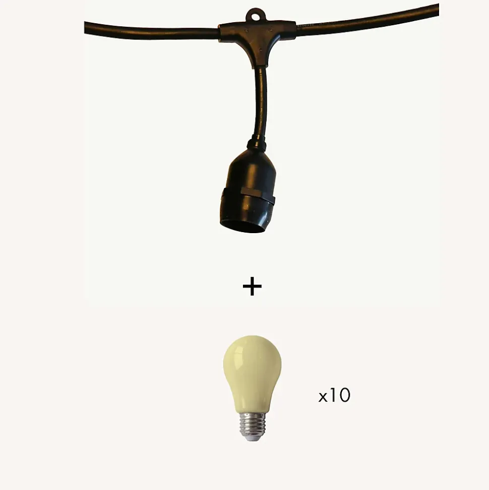 Créez une ambiance digne des bals Ménilmontant et apportez une touche festive à vos extérieurs avec ce kit de guirlande guinguette composé d’une guirlande Java de 5m, 10 douilles et de 10 ampoules E27 blanc chaud ! Indémodable ! Qualité professionnelle !• Type de douilles : E27• Nb d’ampoules : 10 ampoules forme A60• Couleur LED : Blanc chaud• Dimensions : L5m• Couleur du câble : Noir• Prolongeable : jusqu’à 100m• Usage : Intérieur/Extérieur IP44• Alimentation : Sur secteur, inclue• Puissance : 25W• Tension : 230V• Matière : Caoutchouc• Qualité professionnelle• Garantie : 2 ansUsage & installation : Son indice IP44 vous garantit une utilisation extérieure quelque soit la météo tout au long de l’année. Créez un plafond ou redessinez une pergola comme un vrai décorateur. Elle peut servir de décoration sur une terrasse, votre balcon ou bien dans un bar, un restaurant ou un camping.Données techniques & dimensions : Ce kit est composé de la guirlande 551069 et 10 ampoules 550474 blanc chaud, douille E27 forme A60. C’est à vous d’assembler les ampoules. Sa puissance est de 25W. La guirlande mesure 5m, elle est prolongeable jusqu’à 100m.Elle est vendue avec des ampoules. Son câble est noir. Chaque douille est équipée d’un joint d’étanchéité et supporte 15W.Source lumineuse :Chaque douille supporte 15W max. L’ampoule E27 est fabriquée en polycarbonate, elle est donc incassable. Les LED sont à faible consommation d’énergie. Les ampoules haute luminosité vous garanitssent un éclairage optimal pour vos soirées d’été.