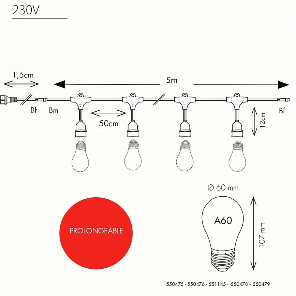 Créez une ambiance digne des bals Ménilmontant et apportez une touche festive à vos extérieurs avec ce kit de guirlande guinguette composé d’une guirlande Java de 5m, 10 douilles et de 10 ampoules E27 Jaune, rouge, vert, bleu et rose ! Indémodable ! Qualité professionnelle !• Type de douilles : E27• Nb d’ampoules : 10 ampoules forme A60• Couleur LED : Multicolore : Jaune, rouge, vert, bleu et rose• Dimensions : L5m• Couleur du câble : Noir• Prolongeable : jusqu’à 100m• Usage : Intérieur/Extérieur IP44• Alimentation : Sur secteur, inclue• Puissance : 25W• Tension : 230V• Matière : Caoutchouc• Qualité professionnelle• Garantie : 2 ansUsage & installation : Son indice IP44 vous garantit une utilisation extérieure quelque soit la météo tout au long de l’année. Créez un plafond ou redessinez une pergola comme un vrai décorateur. Elle peut servir de décoration sur une terrasse, votre balcon ou bien dans un bar, un restaurant ou un camping.Données techniques & dimensions : Chaque douille supporte 15W max. L’ampoule E27 est fabriquée en polycarbonate, elle est donc incassable. Les LED sont à faible consommation d’énergie. Les ampoules haute luminosité vous garanitssent un éclairage optimal pour vos soirées d’été. Source lumineuse :Chaque douille supporte 15W max. L’ampoule E27 est fabriquée en polycarbonate, elle est donc incassable. Les LED sont à faible consommation d’énergie. Les ampoules haute luminosité vous garanitssent un éclairage optimal pour vos soirées d’été.