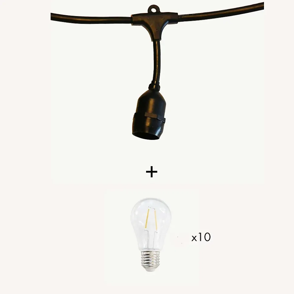 Créez une ambiance digne des bals Ménilmontant et apportez une touche festive à vos extérieurs avec ce kit de guirlande guinguette composé d’une guirlande Java de 5m, 10 douilles et de 10 ampoules E27 blanc chaud à filaments ! Indémodable ! Qualité professionnelle !• Type de douilles : E27• Nb d’ampoules : 10 ampoules forme A60• Couleur LED : Blanc chaud à filaments• Dimensions : L5m• Couleur du câble : Noir• Prolongeable : jusqu’à 100m• Usage : Intérieur/Extérieur IP44• Alimentation : Sur secteur, inclue• Puissance : 20W• Tension : 230V• Matière : Caoutchouc• Qualité professionnelle• Garantie : 2 ansUsage & installation : Son indice IP44 vous garantit une utilisation extérieure quelque soit la météo tout au long de l’année. Créez un plafond ou redessinez une pergola comme un vrai décorateur. Elle peut servir de décoration sur une terrasse, votre balcon ou bien dans un bar, un restaurant ou un camping.Données techniques & dimensions : Ce kit est composé de la guirlande 551069 et de 2 lots d’ampoules 551078 soit 10 blanc chaud à filaments, douille E27 forme A60. C’est à vous d’assembler les ampoules. Sa puissance est de 20W. La guirlande mesure 5m, elle est prolongeable jusqu’à 100m. Elle est vendue avec des ampoules. Son câble est noir. Chaque douille est équipée d’un joint d’étanchéité et supporte 15W.Source lumineuse :Chaque douille supporte 15W max. L’ampoule E27 est fabriquée en polycarbonate, elle est donc incassable. Les LED sont à faible consommation d’énergie. Les ampoules hautes luminosité vous garantissent un éclairage optimal pour vos soirées d’été.