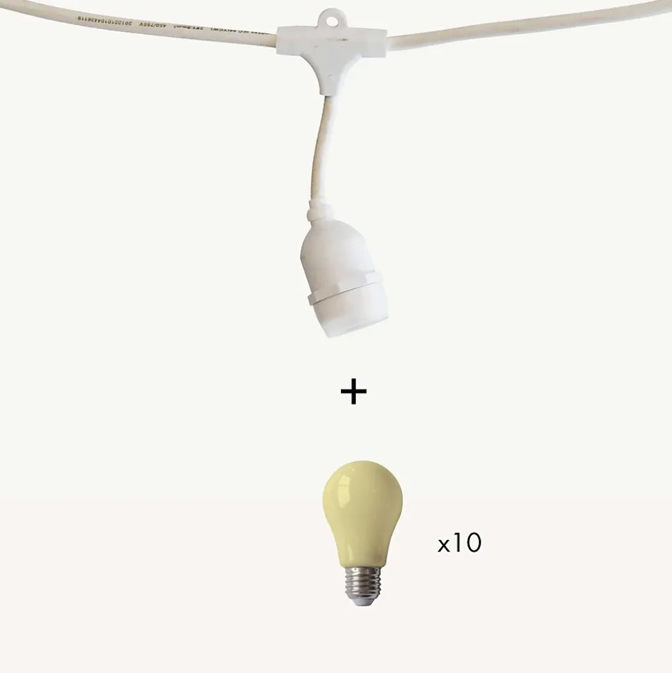 Créez une ambiance digne des bals Ménilmontant et apportez une touche festive à vos extérieurs avec ce kit de guirlande guinguette composé d’une guirlande Java de 5m, 10 douilles et de 10 ampoules E27 blanc chaud ! Indémodable ! Qualité professionnelle !• Type de douilles : E27• Nb d’ampoules : 10 ampoules forme A60• Couleur LED : Blanc chaud• Dimensions : L5m• Couleur du câble : Blanc• Prolongeable : jusqu’à 100m• Usage : Intérieur/Extérieur IP44• Alimentation : Sur secteur, inclue• Puissance : 25W• Tension : 230V• Matière : Caoutchouc• Qualité professionnelle• Garantie : 2 ansUsage & installation : Son indice IP44 vous garantit une utilisation extérieure quelque soit la météo tout au long de l’année. Créez un plafond ou redessinez une pergola comme un vrai décorateur. Elle peut servir de décoration sur une terrasse, votre balcon ou bien dans un bar, un restaurant ou un camping.Données techniques & dimensions : Ce kit est composé de la guirlande 551070 et 10 ampoules 550474 blanc chaud douille E27 forme A60. C’est à vous d’assembler les ampoules. Sa puissance est de 25W. La guirlande mesure 5m, elle est prolongeable jusqu’à 100m. Elle est vendue avec des ampoules. Son câble est blanc. Chaque douille est équipée d’un joint d’étanchéité et supporte 15W.Source lumineuse :Chaque douille supporte 15W max. L’ampoule E27 est fabriquée en polycarbonate, elle est donc incassable. Les LED sont à faible consommation d’énergie. Les ampoules haute luminosité vous garanitssent un éclairage optimal pour vos soirées d’été.