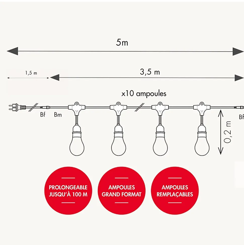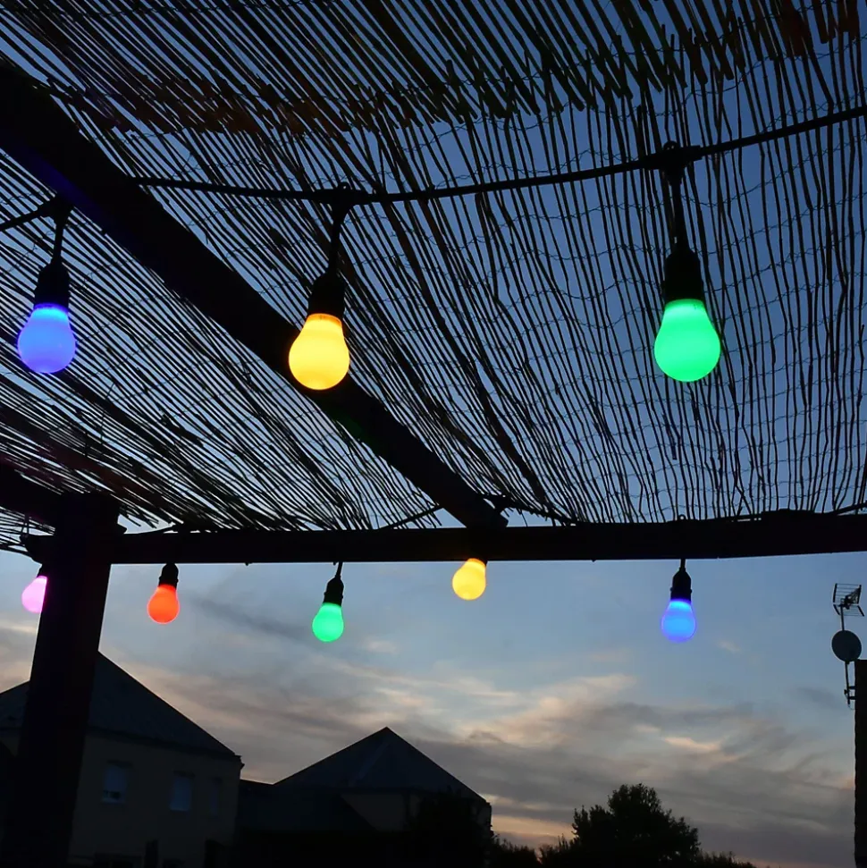 Créez une ambiance digne des bals Ménilmontant et apportez une touche festive à vos extérieurs avec l’authentique guirlande guinguette ! Indémodable ! Qualité professionnelle !• Nb d’ampoules : 10 ampoules LED, forme A60• Culot : E27• Dimensions : L5 m• Prolongeable : jusqu’à 100m• Usage : Intérieur/Extérieur IP44• Alimentation : Filaire• Puissance : 25W• Tension : 230V• Couleur du câble : noir• Matière : Caoutchouc• Qualité professionnelle• Garantie : 2 ansUsage et installation : Son indice IP 44 vous garantit une utilisation extérieure quelque soit la météo tout au long de l’année. Créez un plafond ou redessinez une pergola comme un vrai décorateur. Elle peut servir de décoration sur une terrasse, votre balcon ou bien dans un bar, un restaurant ou un camping.Données techniques et dimensions : Ce pack comprend une guirlande guinguette de 5m et 10 ampoules multicouleurs de 2,5W : 2 x ampoules vertes, 2 x ampoules bleues, 2 x ampoules rouges, 2 x ampoules jaunes et 2 x ampoules roses. La guirlande est polongeable jusqu’à 100m. Aucun cordon de prolongement n’est à rajouter, son câble est équipé d’une connectique de prolongement.Source lumineuse : Les ampoules sont interchangeables et remplaçables. Ampoule haute luminosité, qui vous garantit un éclairage optimal pour vos soirées d’été. Chaque douille est équipée d’un anneau de fixation afin de faciliter son installation.Option : Cette guirlande existe également en blanc chaud et blanc froid.