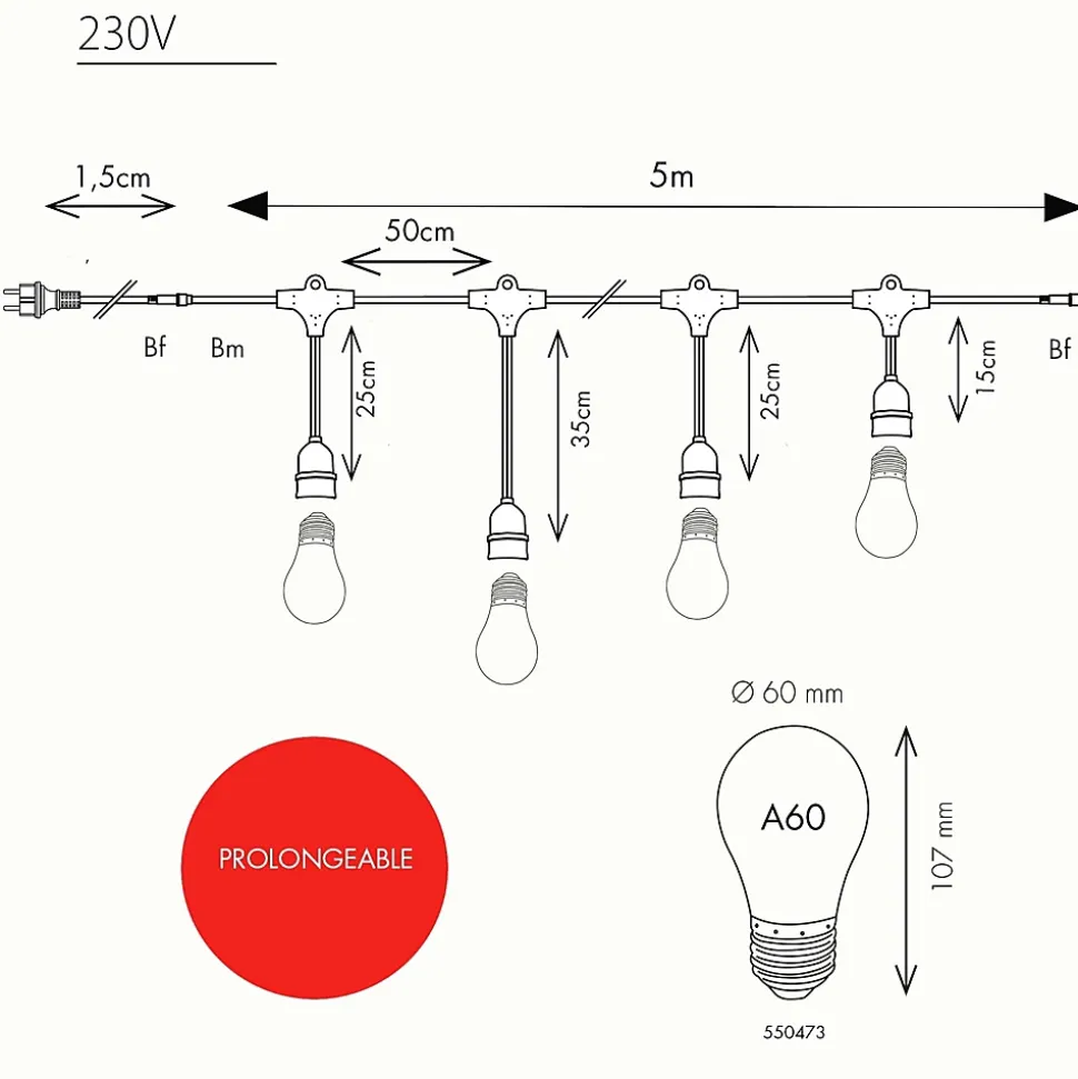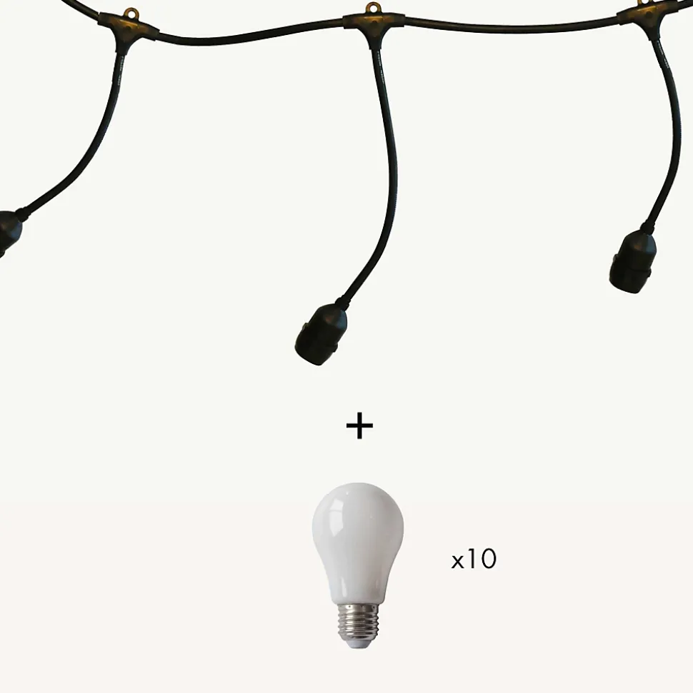 Créez une ambiance digne des bals Ménilmontant et apportez une touche festive à vos extérieurs avec ce kit de guirlande guinguette composé d’une guirlande 5m 10 douilles et de 10 ampoules E27 blanc froid ! Indémodable ! Qualité professionnelle !• Type de douilles : E27• Nb d’ampoules : 10 ampoules forme A60• Couleur LED : Blanc froid• Dimensions : L5m• Prolongeable : jusqu’à 100m• Luminosité : 660 lumens• Usage : Intérieur/Extérieur• Indice de protection: IP44• Alimentation : Sur secteur, inclue• Puissance : 25W• Tension : 230V• Couleur du câble : noir• Matière : Caoutchouc• Qualité professionnelle• Garantie : 2 ansUsage & installations : Son indice IP44 vous garantit une utilisation extérieure quelque soit la météo tout au long de l’année. Créez un plafond ou redessinez une pergola comme un vrai décorateur. Elle peut servir de décoration sur une terrasse, votre balcon ou bien dans un bar, un restaurant ou un camping.Données techniques :Ce kit est composé de la guirlande 551075 et de 10 ampoules 550473 blanc froid douille E27 forme A60. C’est à vous d’assembler les ampoules. Sa puissance est de 25W. La guirlande mesure 5m, elle est prolongeable jusqu’à 100m. Elle est vendue avec des ampoules. Son câble est noir. Chaque douille est équipée d’un joint d’étanchéité et supporte 15W. Il y a 3 mesures de descentes différentes et chaque descente contient un anneau de fixation.Source lumineuse :Chaque douille supporte 15W max. L’ampoule E27 est fabriquée en polycarbonate, elle est donc incassable. Les LED sont à faible consommation d’énergie. Les ampoules haute luminosité vous garanitssent un éclairage optimal pour vos soirées d’été. Sa luminosité est de 660 lumens.
