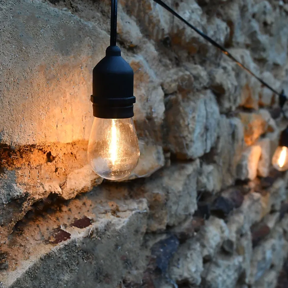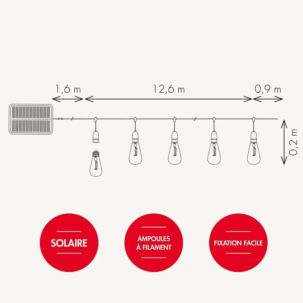 Créez une ambiance digne des bals Ménilmontant et apportez une touche festive à vos extérieurs avec l’authentique guirlande guinguette solaire ! Indémodable ! Qualité professionnelle!• Couleur de la lumière : Blanc chaud• Nb de LED : 15 LED• Nb de douilles : 15 douilles• Type de douilles : E27/E26• Animation : Animé• Dimensions : L12,6m• Prolongeable : Non• Luminosité : 300 lumens• Alimentation : solaire, 2 batteries Accu 18650 1800mAh 3.7V Li-Ion, incluses et rechargable par USB• Autonomie : 6 heures en solaire et USB• Couleur du câble : Câble noir• Usage : Intérieur/Extérieur• Indice de protection : IP44• Matière : PVC Souple• Qualité professionnelle• Garantie : 2 ansUsage et installation :Son indice IP 44 vous garantit une utilisation extérieure quelque soit la météo tout au long de l’année. Créez un plafond ou redessinez une pergola comme un vrai décorateur. Elle peut servir de décoration sur une terrasse, votre balcon ou bien dans un bar, un restaurant ou un camping.Données techniques et dimensions :Cette guirlande guinguette solaire mesure 12.6m. Elle n’est pas prolongeable. Le panneau solaire peut être déporté et débrochable. Vous pouvez également recharger la guirlande par câble USB. Un piquet et une fixation murale sont fournis. Chaque descente en T est composée d’un anneau de fixation pour bien installer votre guirlande.Source lumineuse :La guirlande solaire est composée de 15 douilles avec ampoules blanc chaud. Vous pouvez customisiez la guirlande en changeant et remplaçant les ampoules avec nos ampoules solaires références 551112, 551113, 551114. La guirlande a 4 modes d’animation dont 1 fixe. Activation du mode animée à l’aide d’un bouton sur le panneau solaire. La luminosité est de 300 lumens