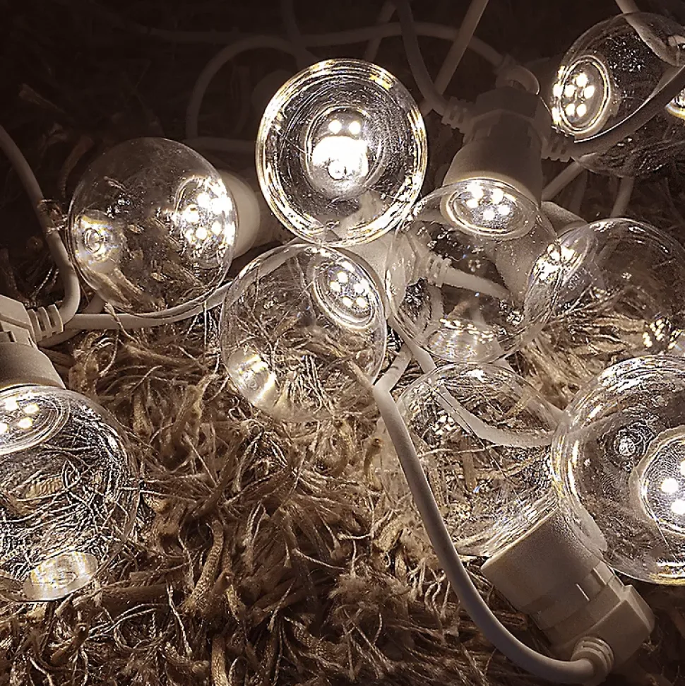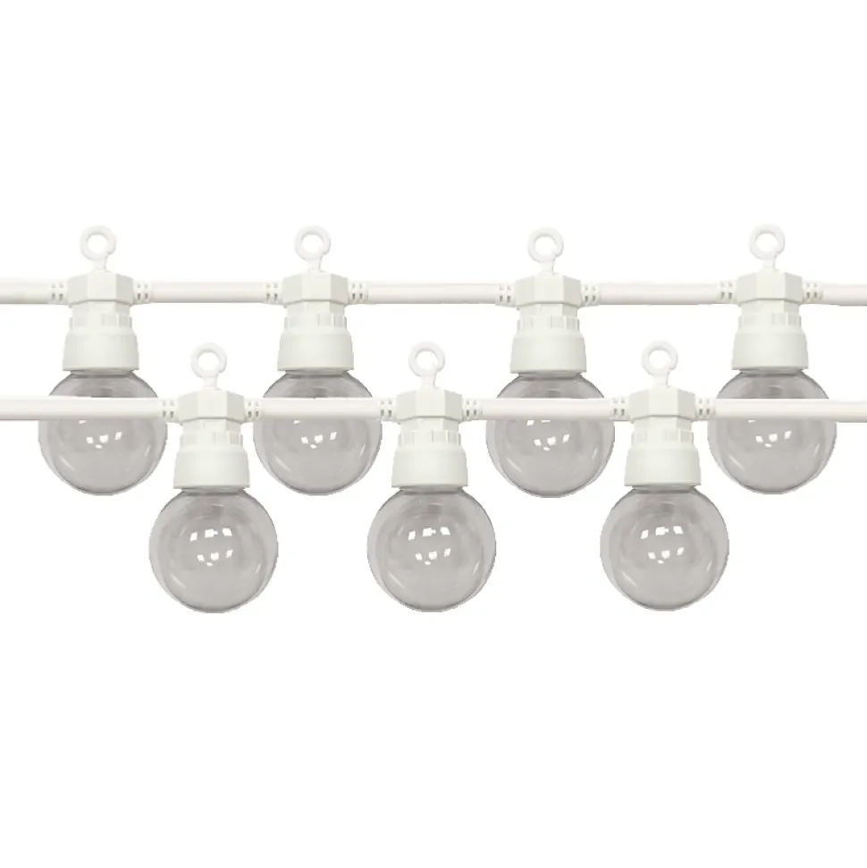 Notre Guirlande Guinguette LED Blanche de 8m possède 10 ampoules LED de couleur d’éclairage blanc chaud ou blanc froid (selon votre choix). Étanche, elle est idéale pour une décoration d’extérieur avec sa certification IP65.Bar, terrasse, pergola, façade, intérieur, cette Guirlande Guinguette peut être utilisée dans de nombreuses circonstances. Idéale pour créer une belle décoration et un éclairage d’ambiance, nous vous la conseillons vivement pour sublimer votre lieu.Aussi disponible avec différentes longueurs, nombre d’ampoules, couleur de câble ainsi que couleur d’ampoule. Pour découvrir l’ensemble de la gamme, vous pouvez consulter la catégorie Guirlande Guinguette LED. ATTENTION: Les ampoules sont des LED intégrées, elles ne sont pas remplaçables. Veiller à bien isoler la prise électrique, toute mauvaise manipulation ou utilisation ne sera pas prise en garanti.