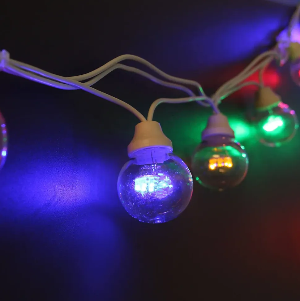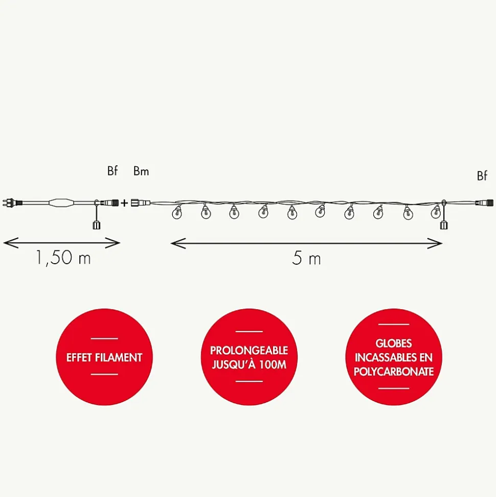 Créez une ambiance digne des bals Ménilmontant et apportez une touche festive à vos extérieurs avec l’authentique guirlande guinguette ! Indémodable ! Qualité professionnelle !• Couleur de la lumière : Multicouleur• Nombre d’ampoules Ø 45 : 10• Dimensions : L:5m• Connectable : jusqu’à 100m• Puissance : 230 V / 4W• Alimentation : Filaire• Couleur du câble : blanc• Matière : Caoutchouc blanc• Garantie : 2 ansUsage et installation : De qualité professionnelle, cette guirlande garantit un éclairage en toute sécurité. Elle peut décorer votre jardin, votre intérieur tout comme un bar, un restaurant.Données techniques : La guirlande est connectable jusqu’à 100m, vous pourrez éclairer une grande surface. Les globes incassables en polycarbonate, le cordon en caoutchouc et l’indice IP44 de cette guirlande lumineuse assurent une étanchéité tout au long de l’année.Source lumineuse : Elle fonctionne avec 60 LED basse consommation. Imitation ampoule incandescente. L’éclairage multicouleur est idéal pour créer une ambiance festive.Option : Vous pouvez retrouver cette guirlande en différents coloris : blanc chaud (câble blanc ou noir), multicolore câble vert.