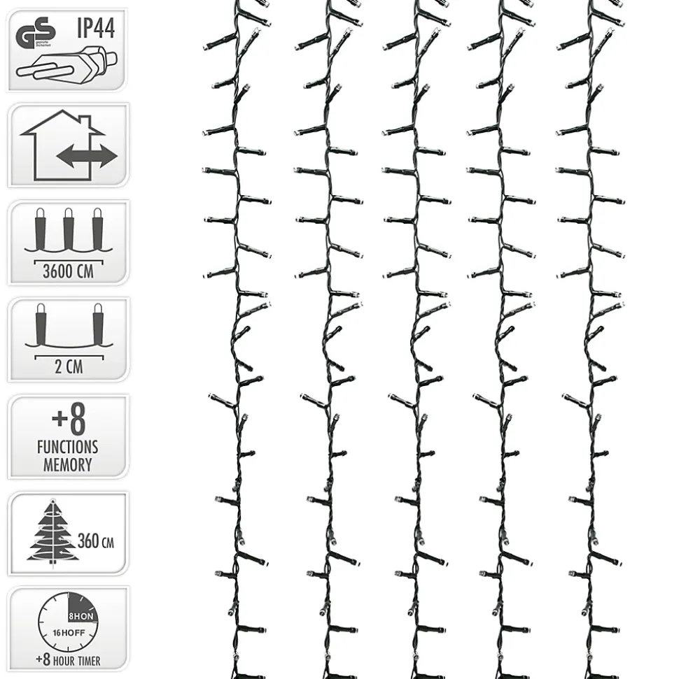 À Noël, les guirlandes lumineuses LED sont incontournables ! Avec leur lumière magique, les guirlandes lumineuses de Noël transforment votre maison en un pays des merveilles décoré pour les fêtes.Grâce aux LED à faible consommation d’énergie, les guirlandes lumineuses de Noël modernes consomment très peu d’électricité et n’entraînent donc pas de frais supplémentaires.Chez ECD Germany, vous trouverez à coup sûr l’éclairage de fête parfait.La belle guirlande lumineuse LED en grappe d’ECD Germany est une merveilleuse décoration de Noël. La lumière colorée est idéale pour la saison froide. La guirlande lumineuse s’installe à merveille sur le mur de la maison, mais la décoration de Noël fait également très bien l’affaire sur le sapin. Ainsi, la guirlande lumineuse convient aussi bien à l’extérieur qu’à l’intérieur. Grâce au câble électrique de 3 m, la guirlande lumineuse est très flexible.Caractéristiques :36m de longueur1800 LEDsPour les arbres jusqu’à 3,6 m de hauteurProtection IP44Câble d’alimentation de 3mPour l’intérieur et l’extérieurDe haute qualitéBelle guirlande lumineuse8 programmes d’éclairage différentsFonction minuterie : 8 heures d’allumage, 16 heures d’extinctionSur la maison ou sur le sapin de Noël8 modes différents1. Combinaison2. Clignotement rapide3. Clignotement séquentiel4. Incandescence lente5. Clignotement lent6. Allumage/extinction7. Scintillement8. Eclairage continuLivraison :1x 1800 LED’s Guirlande lumineuse 36m incl. bloc d’alimentationInformations techniques :Matériau : PVC, ampoules LEDNombre de LED : 1800Couleur de la lumière : multicoloreCourant : 50 Hz, 230 VØ des LED : environ 4,5 mmEspacement des LED : env. 2 cmCâble d’alimentation : env. 3 mLongueur totale : env. 36 mClasse de protection : IP44 (pour l’intérieur et l’extérieur)Couleur du câble : vert foncéminuterie incluse (8 heures de marche – 16 heures d’arrêt)