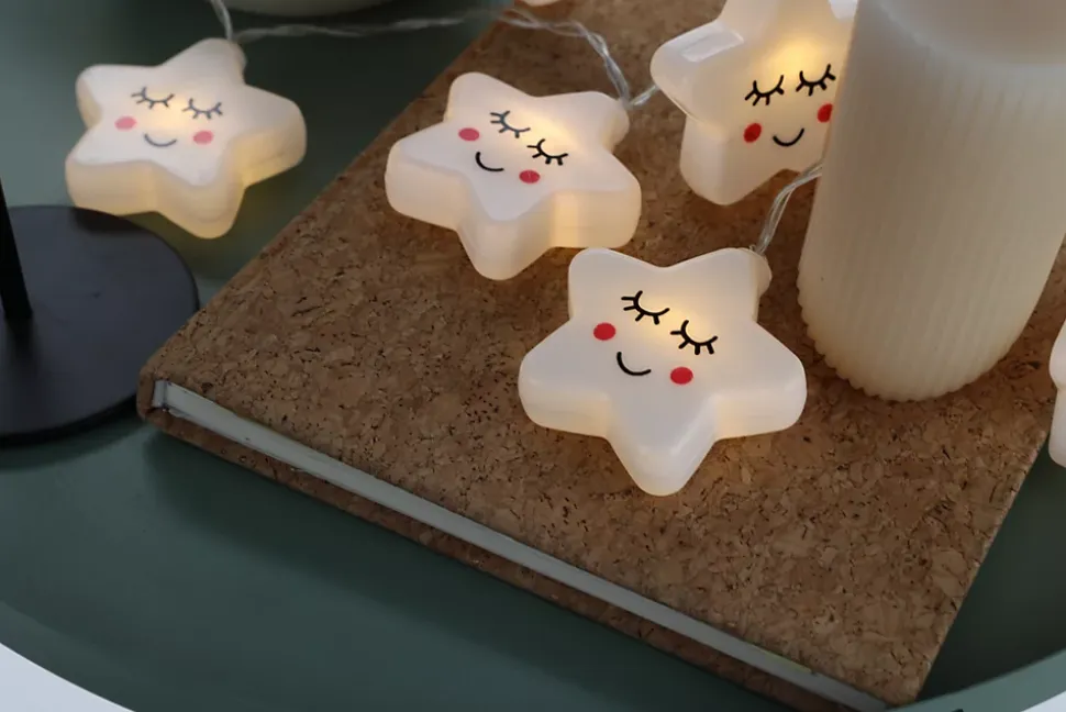 - Avec ses adorables étoiles souriantes, cette guirlande lumineuse crée une ambiance douce et réconfortante, parfaite pour une chambre d’enfant ou un coin détente.