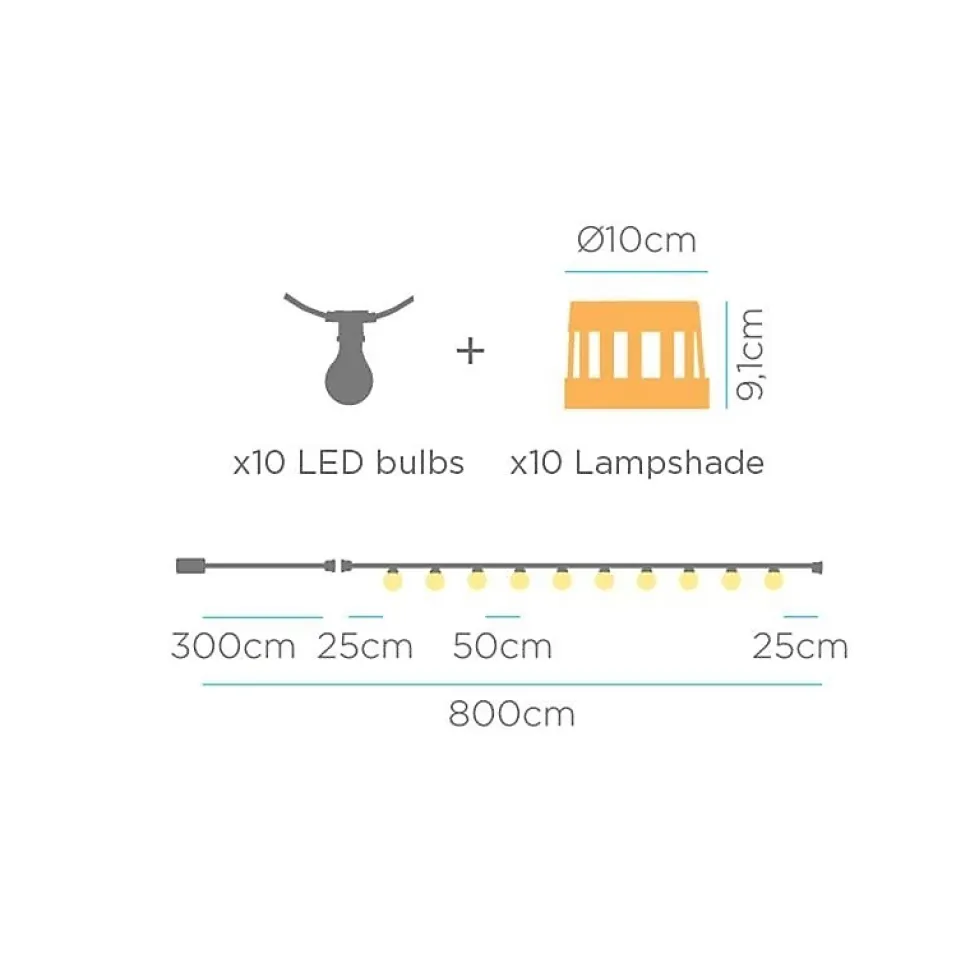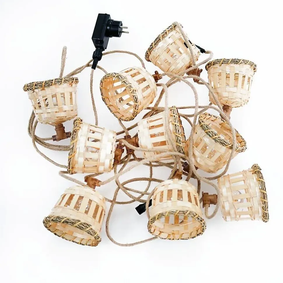 Les caractéristiques techniquesCette guirlande lumineuse étanche peut être installée aussi bien à l’intérieur qu’en extérieur grâce à son indice de protection (IP) 44 qui en garantit l’étanchéité. La guirlande est aussi résistante au vent et au soleil.Cette guirlande mesure 8 mètres et est équipée de 10 ampoules transparentes.Vous pouvez relier plusieurs guirlandes à la suite (maximum 4) grâce aux connections livrées avec.Les avantages esthétiques Donnez un air de fête à vos extérieurs avec cette guirlande lumineuse.Elle est composée d’un cordon en jute et de 10 ampoules transparentes dans un abat-jour en bambou et rotin tressé main du plus bel effet qui donnera à votre éclairage un aspect naturel.Elle égaiera aussi bien vos fêtes estivales dans une ambiance guinguette que votre buffet de mariage en belle saison.En hiver, elle contribuera à la magie des fêtes de fin d’année en parant votre façade ou vos arbres de jolies lumières.Elle existe également en version solaire (ref LUMAUR800XXSLNW)