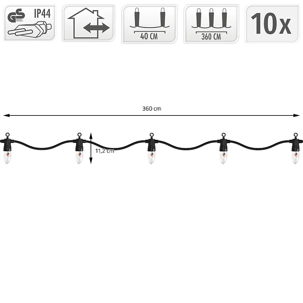 Cette guirlande lumineuse 10 ampoules llamme LED est très décorative pour les fêtes de fin d’année ! Elle dispose d’un mode d’éclairage fixe et se branche sur une prise électrique IP44 normes CE inclus. Ampoule flamme E14 1,3 W c…Voir la présentation