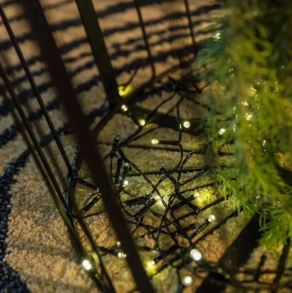 Guirlande solaire LUMI JARDIN YOGY WARM de 200 LED sur 16,9 m offrant une lumière blanche chaude décorative pour jardin et intérieur; autonomie jusqu’à 8 h après 4–6 h de charge solaire, 8 modes d’éclairage, IP44 et traitement UV, fournie avec panneau solaire, piquet et support réglable pour une installation sans fil facile.