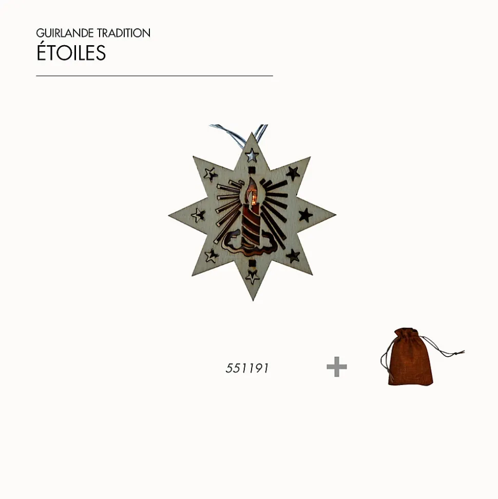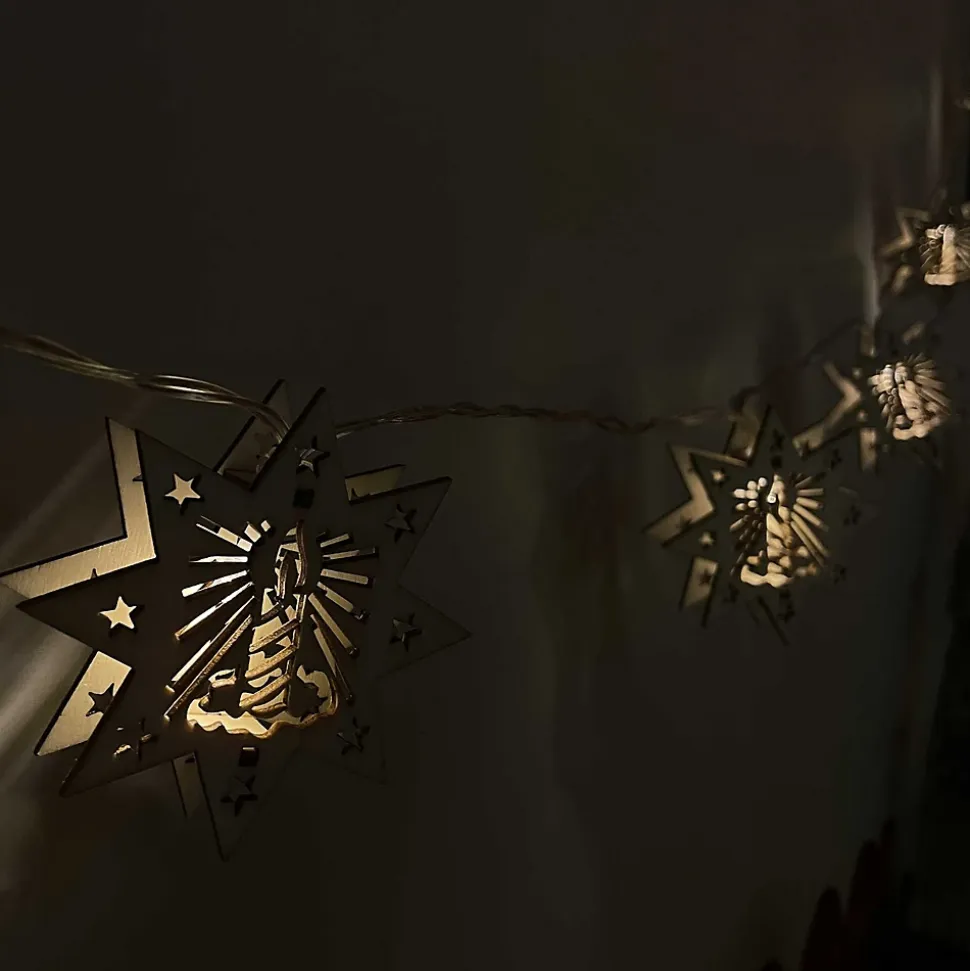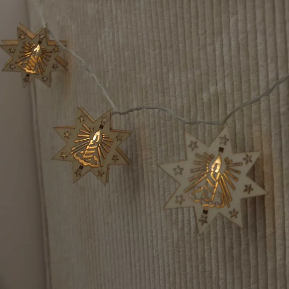 Cette guirlande en bois illumine votre tête de lit ou décore vos meubles. Elle vous apportera une lumière chaleureuse. L’effet 3D du bois apportera un effet cosy à votre ambiance.• Couleur LED : Blanc chaud• Dimensions : L1,8m• Nb de LED : 10 LED• Animation : Fixe• Luminosité : 50 lumens• Alimentation : 2 piles AA 1,5V Alkaline (non incluses)• Couleur du câble : transparent• Matière : Produit en PVC souple et bois• Usage : Intérieur• Garantie : 2 ansUsage & installation :Simple d’utilisation, fonctionnement avec un boîter on/off/timer. La guirlande est livrée avec un pochon en toile de jute pour cacher le boîtier piles. Le mode Timer vous permet d’actionner un minuteur à votre guirlande : Allumage pendant 6 heures (tous les jours à la même heure) à l’arrêt pendant 18 heures. Utilisation intérieure exclusivement.Données techniques & dimensions :La guirlande mesure 1,80m. La couleur du câble est transparente.Source lumineuse :Chaque guirlande comporte 10 LED blanc chaud fixe.