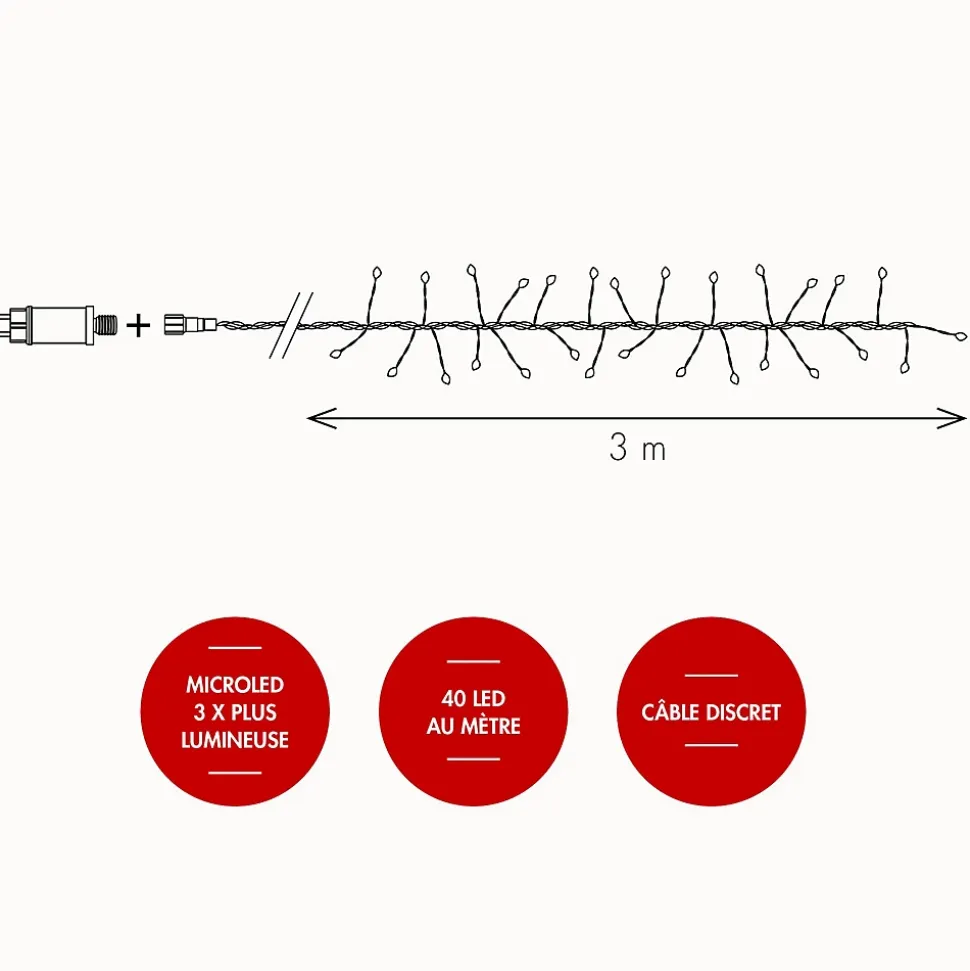Idéale en DIY autour d’un cadre, d’une échelle ou encore dans un vase, laissez parler votre créativité ! Sa grande longueur et sa luminosité réveilleront vos soirées.• Couleur de la lumière : ivoire• Nombre de LED : 240• Luminosité : 432 lumens• Dimensions : L:6m, 40 LED au mètre• Puissance : transformateur 230 V/17W• Alimentation : Filaire• Couleur du câble : argent• Matière : Produit en PVC souple câble sécurisé par un revêtement.• Connectable : non• Garantie : 2 ansUsage et installation : Cette jolie guirlande trouvera sa place partout. Son câble discret et ses mircoLED habilleront murs, ciel de lit, vases, arbres. Décorez avec finesse et élégance. Données techniques et dimensions : Dotée de l’indice de protection IP44, votre guirlande résistera à toutes les météos. Simple d’utilisation, il vous suffit de la brancher à une prise secteur. Source lumineuse : Cette guirlande est composée de 40 LED au mètre. La MicroLED nouvelle génération est trois fois plus lumineuse qu’une LED classique.Option : Cette guirlande existe en 3m et 6m, et se décline en blanc froid et multicolore.