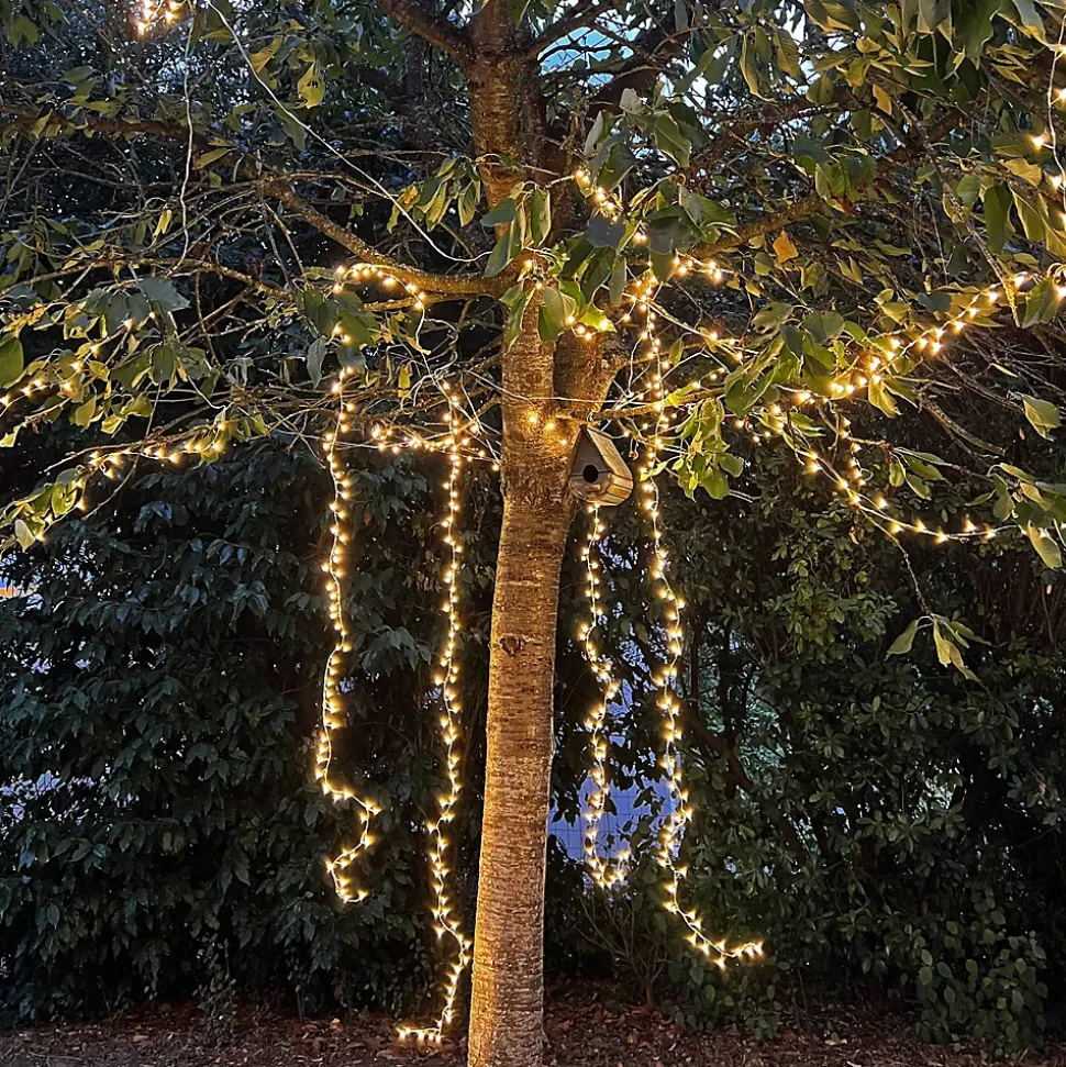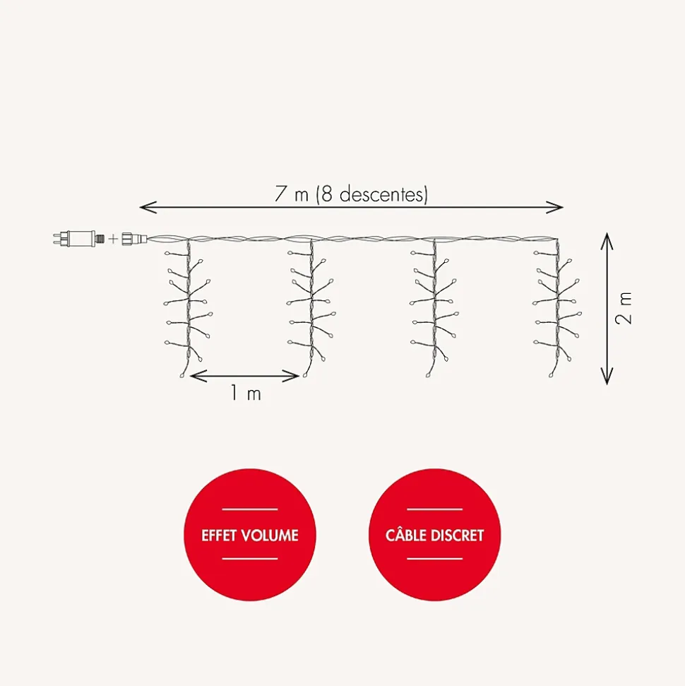 Cette guirlande pampilles composée de 8 descentes lumineuses microled transforme vos extérieurs et intérieurs. Idéale autour d’un arbre, enroulez ses longues descentes autour des branches et la lumière éclairera votre jardin. • Nb de LED : 320 microLED• Couleur de LED : Blanc chaud• Couleur du câble : Câble argent• Nb de descentes : 8 descentes de 2m – 40 LED/descente• Animation : Fixe• Dimensions : L7m• Puissance : 12W• Tension : 230V• Lumens : 500 lumens• Alimentation : Sur secteur, incluse• Matière(s) : PVC Souple• Usage : Intérieur/Extérieur• Indice de protection : IP44• Garantie : 2 ansUsage et installation : Cette jolie guirlande trouvera sa place enroulée dans un arbre avec quelques descentes tombantes ou alors elle habillera parfaitement vos rideaux pour apporter une ambiance chaleureuse dans votre salon. L’indice IP44 permettra une résistance à toutes les météos tout au long de l’année. Simple d’utilisation, il vous suffit de la brancher à une prise secteur.Données techniques et dimensions : Cette guirlande mesure 7m de longueur et est composée de 8 descentes. Chaque descente mesure 2m. Son câble est argenté et son alimentation est inclue. Le câble est très flexible, vous pourrez enrouler les descentes facilement.Source lumineuse : Cette guirlande pampille contient 320 microled fixe très lumineuses. Elle est compose de 8 descentes de 2m. Chaque descente contient 40 LED.