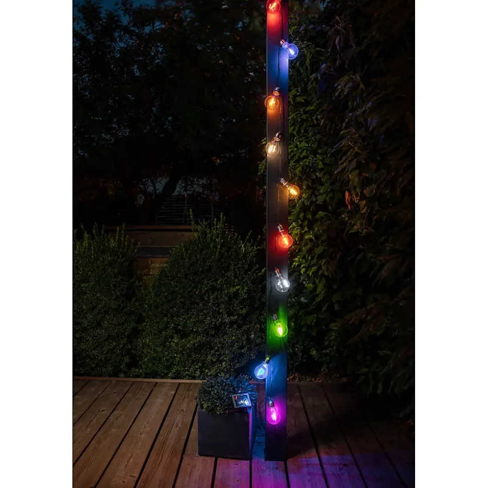 Guirlande guinguette à énergie solaire en plastique avec 10 LED multicolores à filament COB. Puissance panneau solaire 0,29 W. Durée maximum d’éclairage 8 heures. Interrupteur on/off manuel. Batterie rechargeable Ni-Mh AA 600mAh incluse. Design rétro guinguette. Résistant aux intempéries, sans câblage nécessaire, installation flexible.