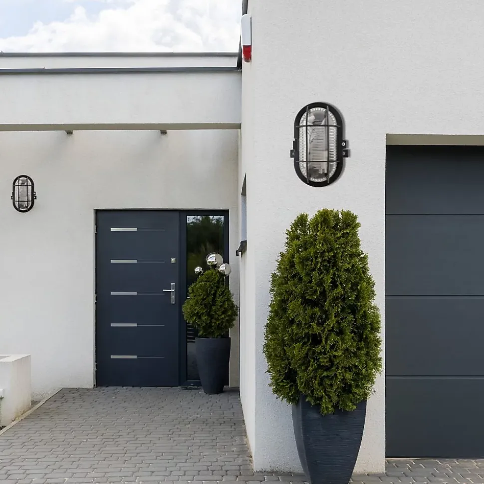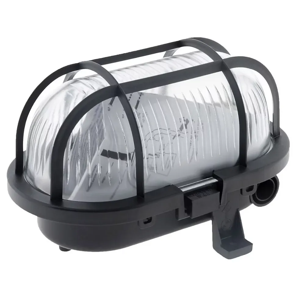 Hublot ovale en finition noire monté sur socle en plastique haute résistance et vasque en verre haute résistance à la chaleur (650°). Livré avec grille de protection. Caractéristiques : Tension 220V – 240V – 50Hz – Classe II Puissance max 60W De qualité professionnelle, ce type de hublot s’installe facilement pour éclairer un local extérieur, une cuisine d’été, votre garage, votre entrée ou votre jardin durant toute l’année Existe en couleurs : Noir (3545411410019), Blanc (3545411410002),
