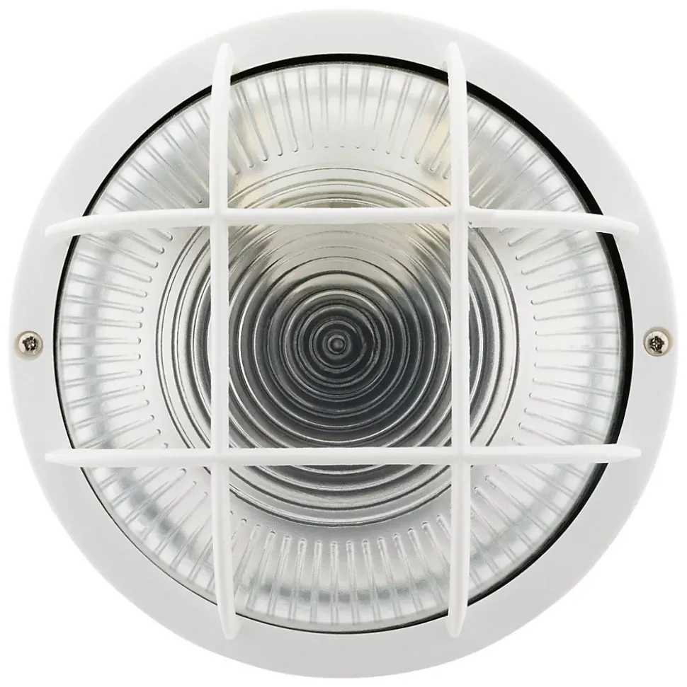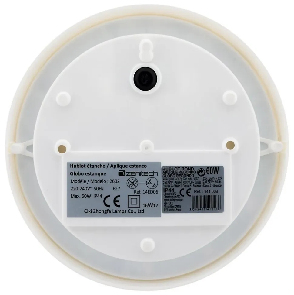 Hublot rond en finition blanche monté sur socle en plastique haute résistance et vasque en verre haute résistance à la chaleur (650°). Livré avec grille de protection. Caractéristiques : Tension 220V – 240V – 50Hz – Classe II Puissance max 60W De qualité professionnelle, ce type de hublot s’installe facilement pour éclairer un local extérieur, une cuisine d’été, votre garage, votre entrée ou votre jardin durant toute l’année Existe en Forme : Ovale14W (3545411410408), Ovale8W (3545411410385), Rond100W (3545411410071), Rond60W (3545411410088)