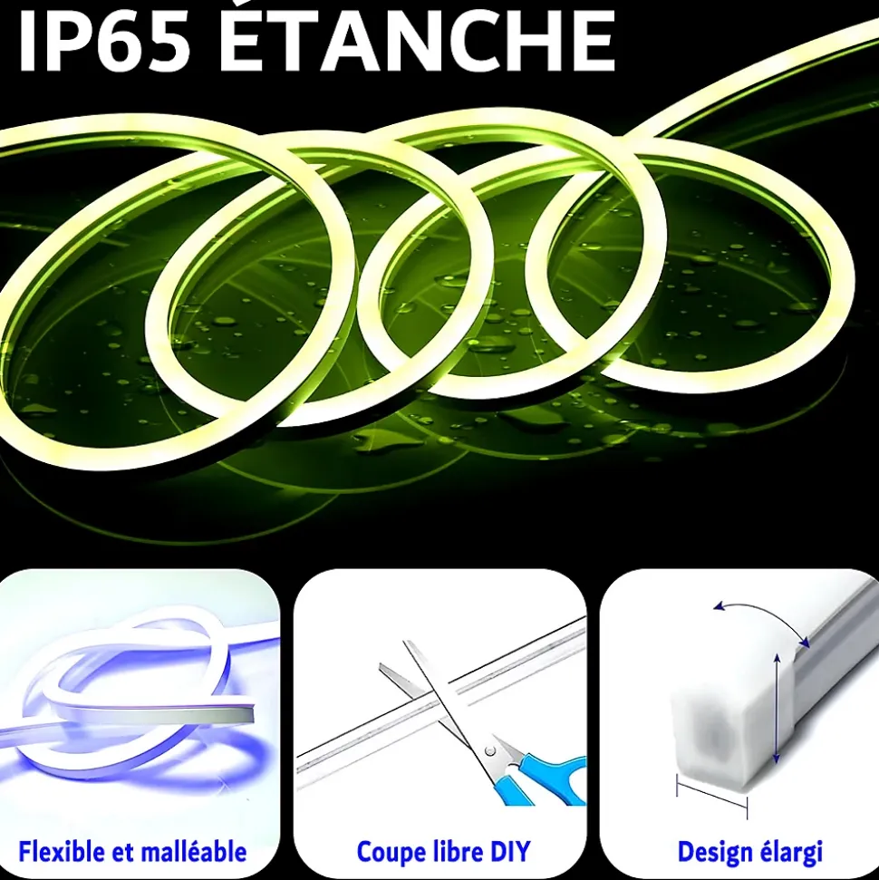 Application intelligente et télécommande : Associez la bande LED néon via Bluetooth et vous pouvez utiliser l’application pour contrôler la couleur, la luminosité, la saturation et la vitesse de la corde lumineuse.Lampes de sécurité étanches : La bande de néon est conçue avec du silicone imperméable à l’extérieur, ce qui rend l’étanchéité jusqu’à IP65. Utilisation d’une alimentation à tension sûre de 12V pour réduire le risque de choc électrique. (Le contrôleur et la télécommande ne sont pas étanche)Coupable et flexibilité : Découpable libre DIY, vous pouvez le découper pour créer un décor résidentiel spécial ou concevoir des enseignes commerciales uniques. Grâce à sa flexibilité parfaite, la bande de corde au néon peut être facilement pliée dans n’importe quelle forme ou conception et coupée à la longueur que vous voulez.Synchronisation de la musique et diverses méthodes de contrôle : Les lumières de corde de néon est synchronisation de la musique. Il dispose d’un microphone haute sensibilité intégré et la couleur peut changer avec la musique. Vous pouvez contrôler le mode musique de la corde lumineuse à tout moment avec l’application mobile, la télécommande et le bouton de la corde lumineuse, afin que vous puissiez profiter davantage du bonheur apporté par la musique. Kit complet : oui (livré prêt à brancher, une télécommande + un transformateur + un contrôleur + 30 fixations fournies)Tension de la bande LED : 12vType de LED : néon LEDConsommation : 15 watts par mètreClasse énergétique : GPuissance lumineuse : 1500 lumen par mètreAngle de diffusion : 120°Durée de vie : 35 000 heuresDimmable : ouiLargeur : 10 mmÉpaisseur : 5 mmCouleur d’éclairage : RGB multicouleurRuban LED autocollant : nonRuban LED flexible : ouiRuban LED sécable : ouiIndice IP : IP65Certifications : CE – RoHsGarantie : 2 ans